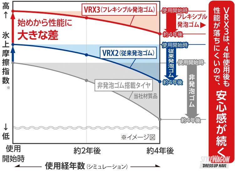 とはいえタイヤのゴムは月日が経つと硬くなり、次第に食いつきが悪くなるもの。そこでブリザックVRX3で新たに採用したフレキシブル発泡ゴムは、やわらかさを維持できる分子設計に。だから4年経過してもしなやかさを維持し、氷上、雪上路面にしっかりと食いつく。つまりタイヤが減りにくく、なおかつ性能の落ち幅も少ないのだ。