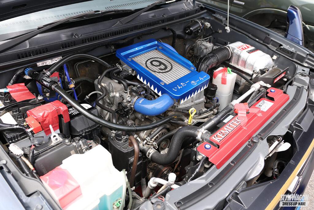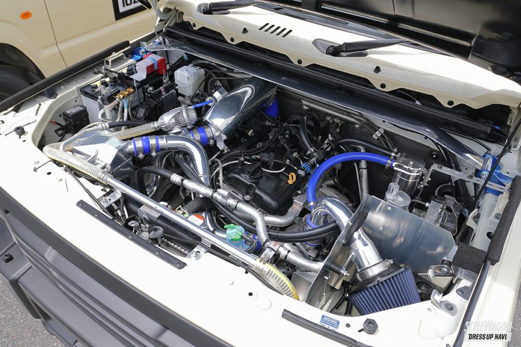 東方プロジェクトというゲームのキャラ、ブルートレインのプレートに着想を得たタイヤカバーのグラフィック等々、見た目もインパクト抜群なJB23。元々四駆に興味はあったが、ジムニーを手に入れオフロードにハマり、レインボーオートのスーパーラップを見てサーキット走行にハマった。車高は20mmアップとオフ仕様時と同じなのも面白い。