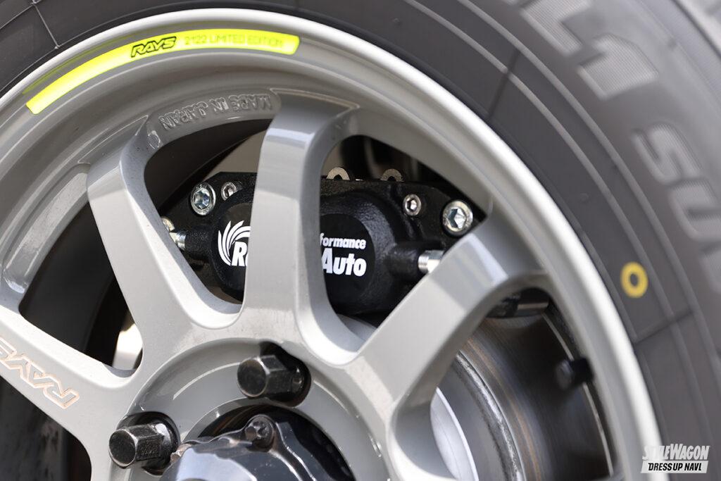 外観はほぼノーマルだが、中身はタップリ手数を打つ。そんな質実剛健なじむけんさんは、当初サーキット走行は想定していなかったそう。「悪いおじさんに…」そそのかされたのでしょうか(笑)。重い車重を考慮し、パワーアップ系にも注力。タービンは純正だが、ECUも見直した。そんなパワーに合わせブレーキも強化。レインボーオートの新作を導入したのだ。