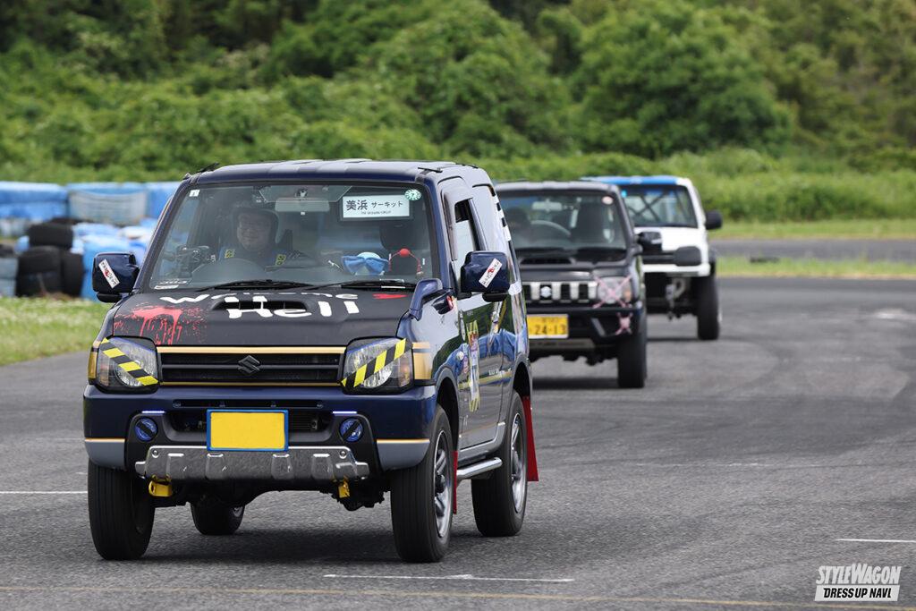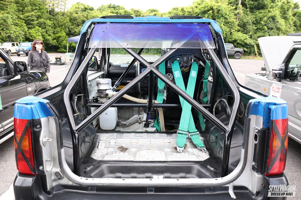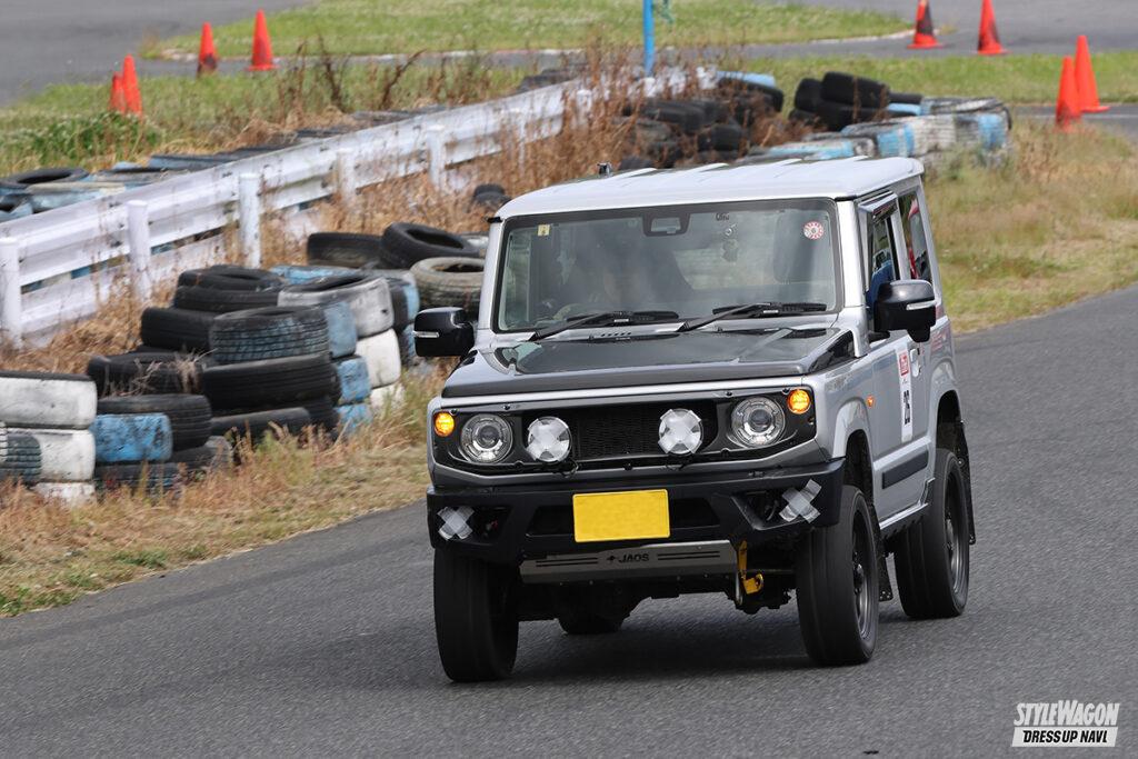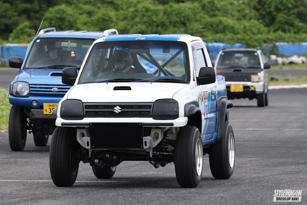 過去に幌車があったジムニーだが、この型では…。オーナーはご主人と当車を共有しているが、実は「転倒して壊れたので切ってもらいました」とのこと。元々は箱車だったのです。普段はオフロードをメインに楽しんでいるそうだが、この日はタイヤを履き替えサーキット走行。初めてだったが「面白かった、また参加したいです」と意欲的だったゾ。