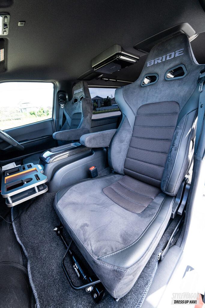 ハイトなボディ形状のハイエースだからこそ起こりやすい走行中のふらつきやロール、そして不快な振動。長く乗っているうちにそれがストレスになってしまう。乗り味を改善する補強アイテムも出回っているが、他では手に入らない画期的な製品が新たに登場した。それがゲンブのモーションコントロールビーム。大手自動車部品サプライヤーであるアイシンの特許技術を投入しており、ケースの内部に組み込まれたスプリングが振動を吸収。ボディの変形や振動を抑制し、シャキッとした走りへと導く。しかも取り付ける位置も斬新で、一般的な補強パーツのような下まわりではなく、フロントシートのスライドレール間に取り付ける手法。シートの振動を抑えるだけでなく、サスペンション剛性の向上も実現。結果的に長く乗っても疲れにくいハイエースが手に入る。ボルトオンで簡単に体感できるから、費用対効果はバツグン。