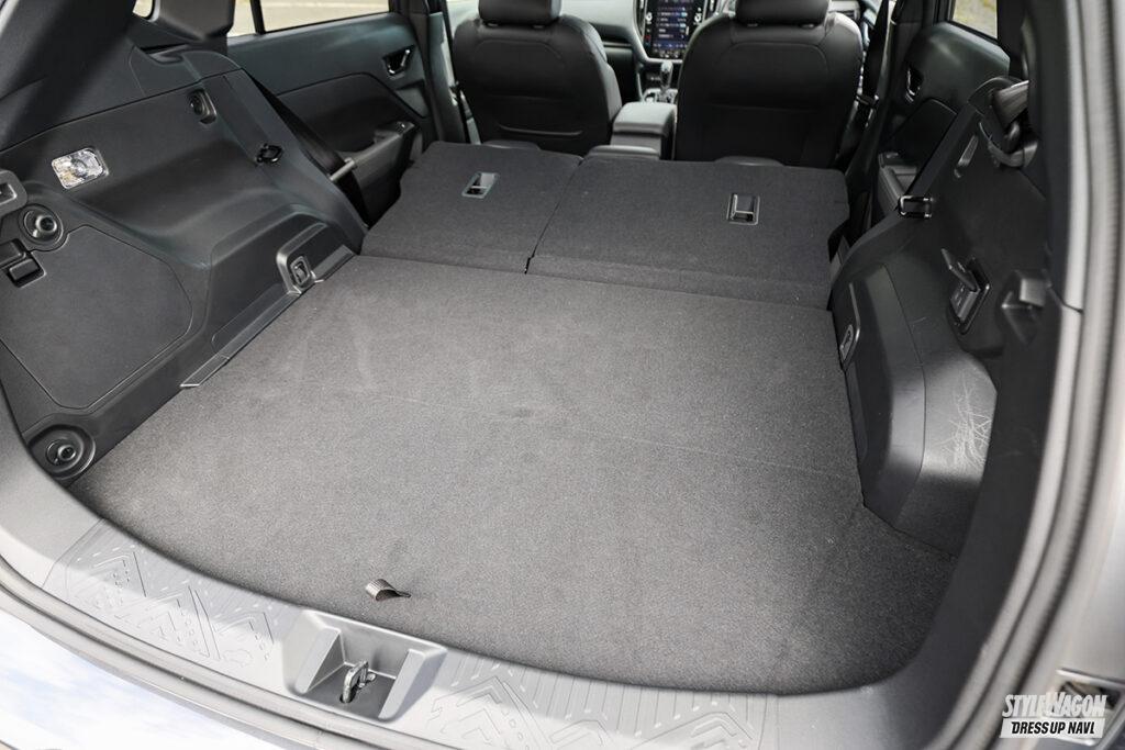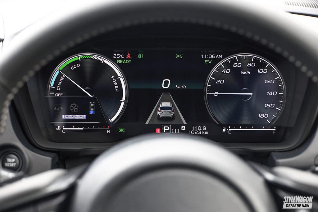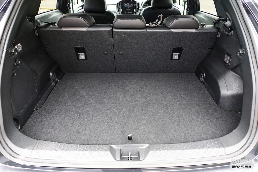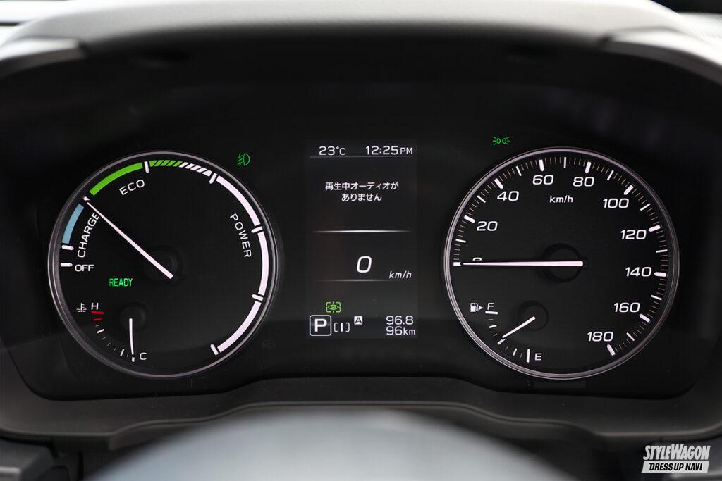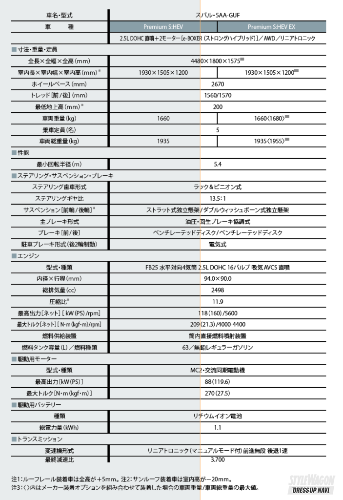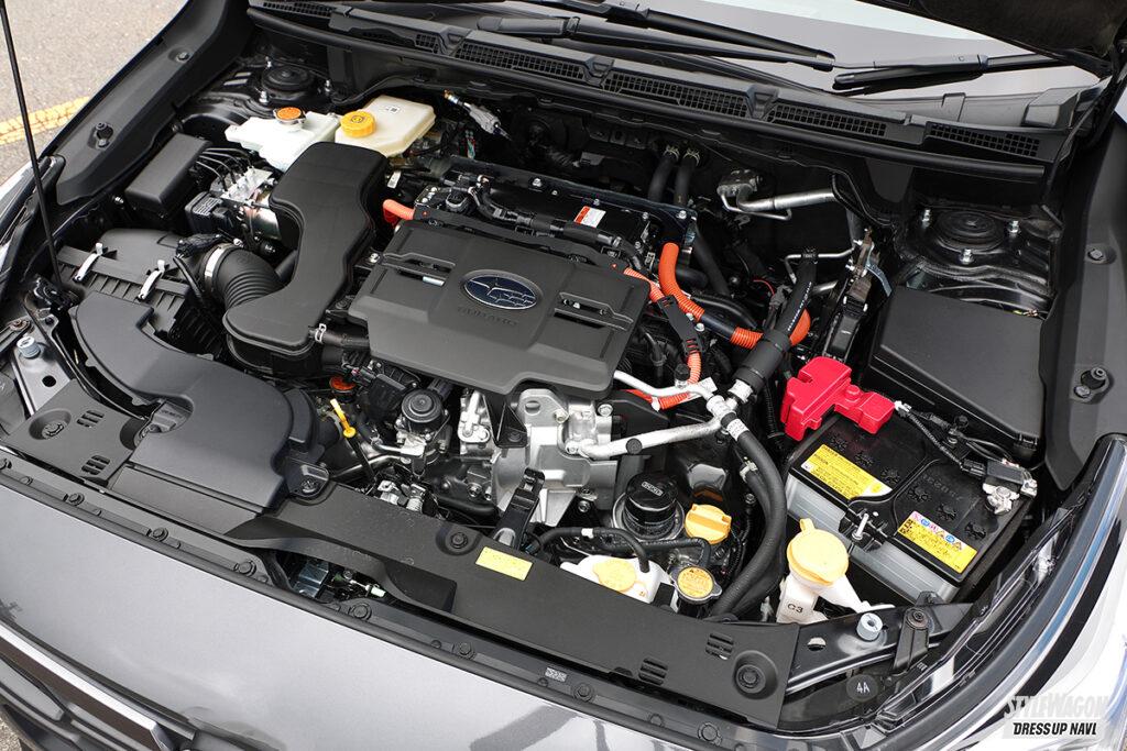 外観は専用デザインの18インチアルミホイール、専用デザインの「e-BOXER」エンブレム(S:HEVのロゴやエンブレムは用意されない)くらいでMHEVとの差は少ない。内装はブラックを基調に、ブレイズガンメタリックのアクセントが配されているのが特徴で、ファブリックシートは専用になる(本革はオプション)。ラゲッジは、床下に積むバッテリーの影響で若干床面が高くなり、荷室容量はMHEV 311L(床下4L)に対し、279L(床下1L)と小さくなっている。後席を起こした状態で、ゴルフバッグは3セットから2セットと積載数が減るものの、キャンプなどのアウトドアに対応する積載力をほぼ維持している。
