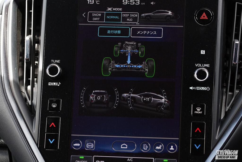 芝生路は、一度停まってしまうと夏タイヤでは抜け出せない泥濘になっていたが、「X-MODE」をスノー/ダートやマッドに入れれば走破性が増す。200㎜の最低地上高や機械式AWDならではの高い機動力も確認できた。専用セッティングが施された足まわりは、上下動、左右の動きを抑えたフラットライド感を享受できる。