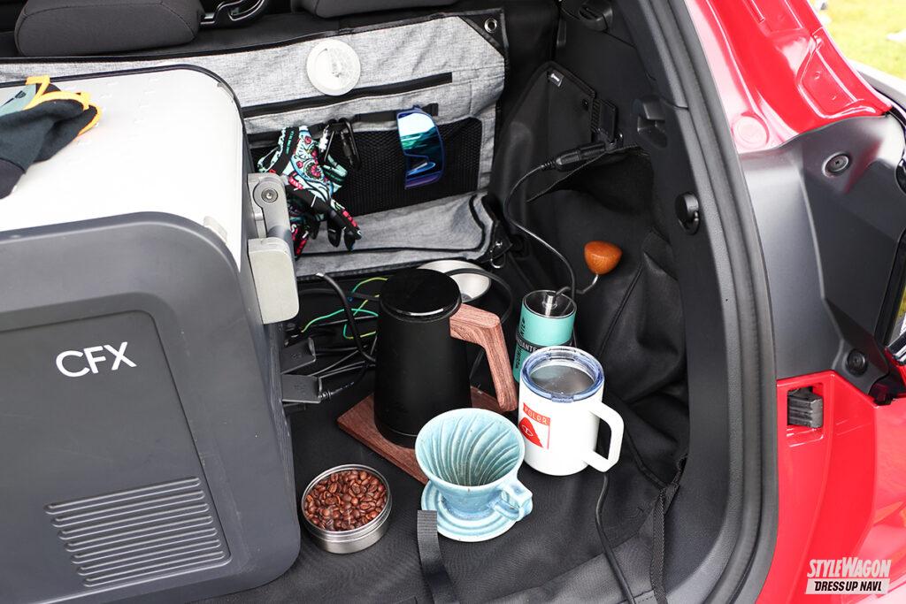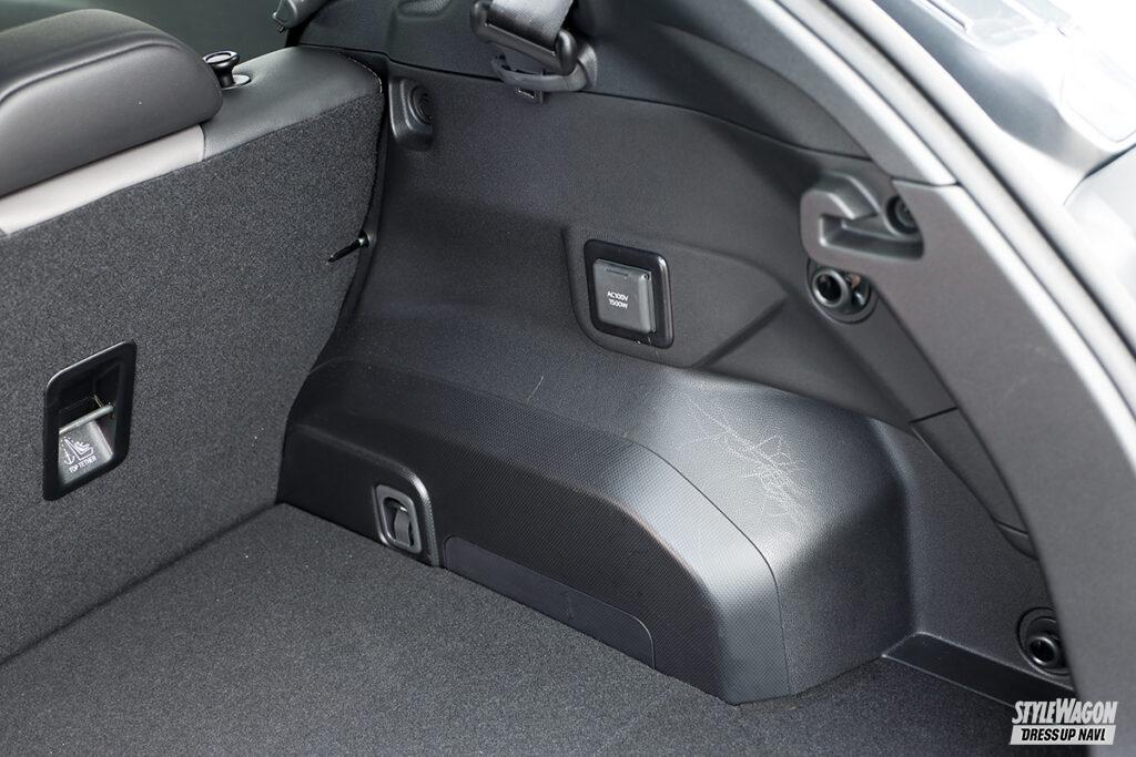 今回の撮影車両には、横基調となるブラックのフロントグリルが精悍さを印象づけていて、フードデカール、フロントノーズガーニッシュ、LEDアクセサリーライナー、ドアアンダーガーニッシュ、オールウェザーカーゴカバーなどがクロスオーバーモデルらしいアウトドア感を演出。さらに、サードパーティのルーフラックやキャリアなどが装着されていた。ストロングハイブリッド化により荷室容量は若干減ったが、純正アクセサリーなどを使うことで多彩なアクティビティに対応する。