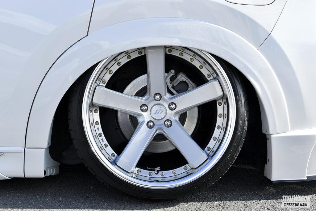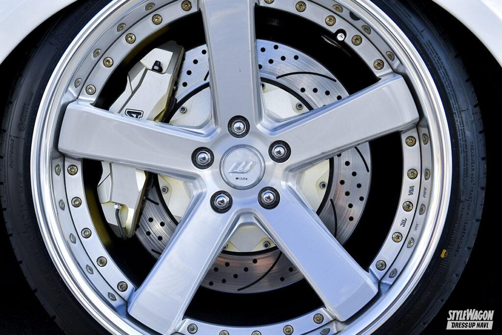 WHEEL●ワーク・バックレーベルジーストBST2(20×F9.5J+10,R10.0J±0) TIRE●(235/35) EXTERIOR●F/S=ガレージベリー、R=クライメイト、オーバーフェンダー=アドミレイション TUNING●エアサス=エアフォース、アッパーアーム/ロアアーム=ワンオフ 他
