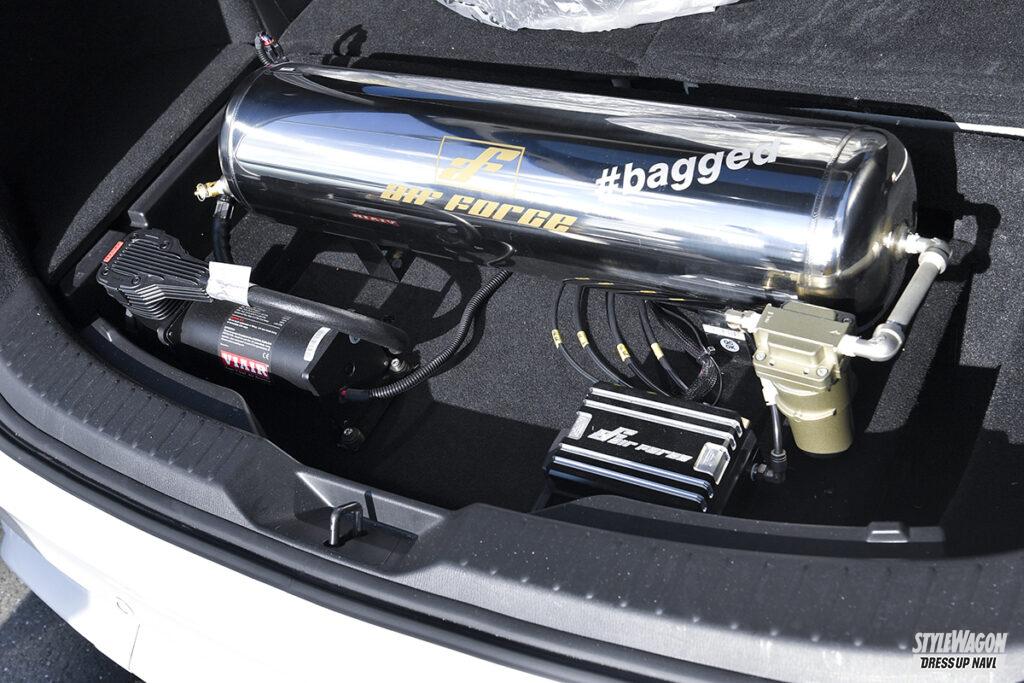 SUVでは希少な3列シート車。家族が増えたのを機会にミニバンの購入も検討したが、SUVでカスタムしたいという思いもあってCX-8を選択。SUVのカスタムといえば、シャコタンよりもリフトアップのイメージが強いが、購入前から目指すスタイルはシャコタン一択だったというこだわりよう。納車即導入したのがエアフォースのエアサスで、より車高を下げるためにリアのアーム類は干渉部分を回避するためにフル加工。さらに低さをアピールするための役目を担うのがオーバーフェンダーで、ホイールのリムにフェンダーを被せるツラウチ仕様で視覚的な低さを主張。しかもフロントは純正フェンダーアーチを20mmの上げ加工、リアはフェンダー内側のツメを折ってフェンダーとホイールの干渉を回避するなど、純正フォルムを崩さないための苦労が見えない部分に数多くある。