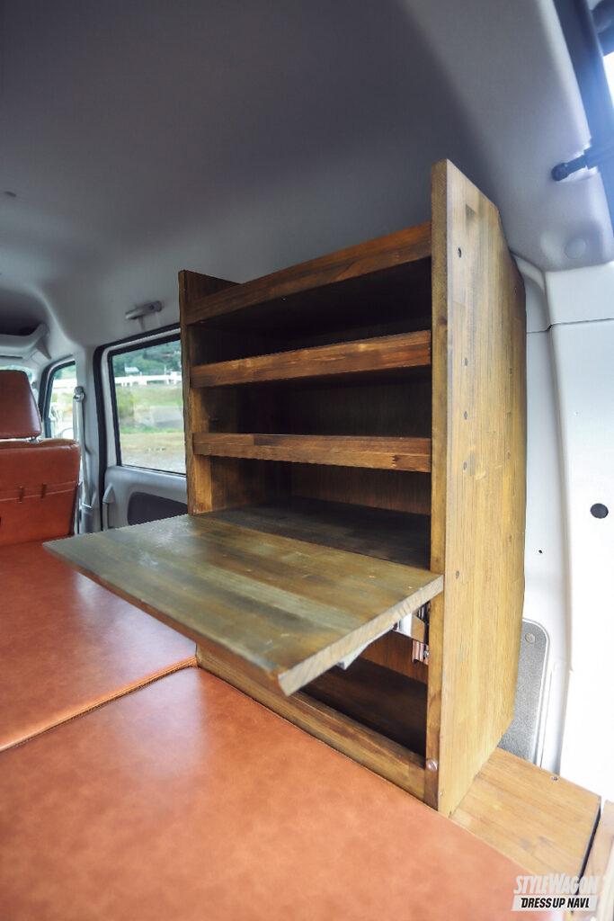 ティースタイルのベッドキットは、ヴィンテージ感あふれるアンティークレザーを採用。しかもラインアップはブラウン・キャメル・クリームイエロー・ボルドー・ブラック・ホワイトスモーク他と、かなり豊富。レザー色を基調に内装のカスタマイズを楽しむのもアリ。床面には大きな引き出しがあり、テーブルにも早変わりする。