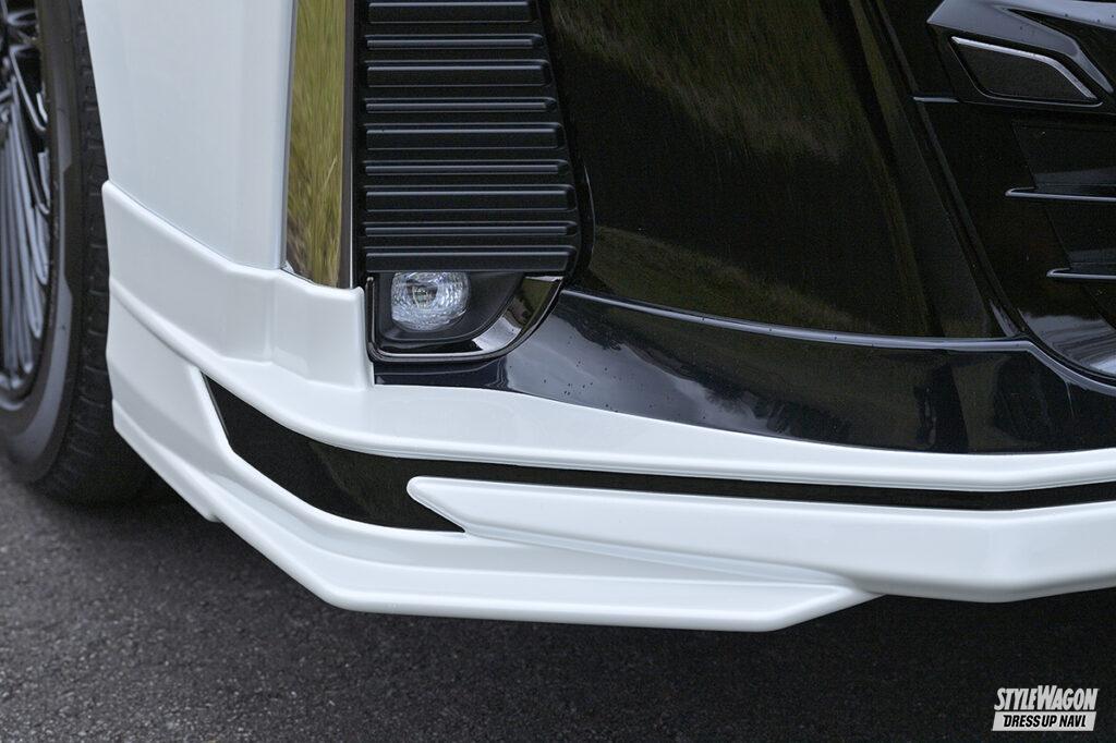 本誌4月号で紹介した40アルファード用エアロとは、また違ったスタイルを見せつけるのがポイント。アルファードではメッキを巧みに用いて高級感アップを図ったが、ヴェルファイアは同社のレースイメージを注ぎ込みスポーティ路線で仕上げた。だから、大柄な被せ式だったアルファード用に対し、コチラは小ぶり&シンプル。しかし塗分け(白塗装済みの場合)まで駆使してアイテムの存在感を高め、スピード感をアピールしてきたのだ。オリジナルの鍛造ホイール、ブレンボとのコラボ仕様ブレーキキットも用意するが、スポーティなヴェルファイアとの相性が抜群なのは言うまでもない。