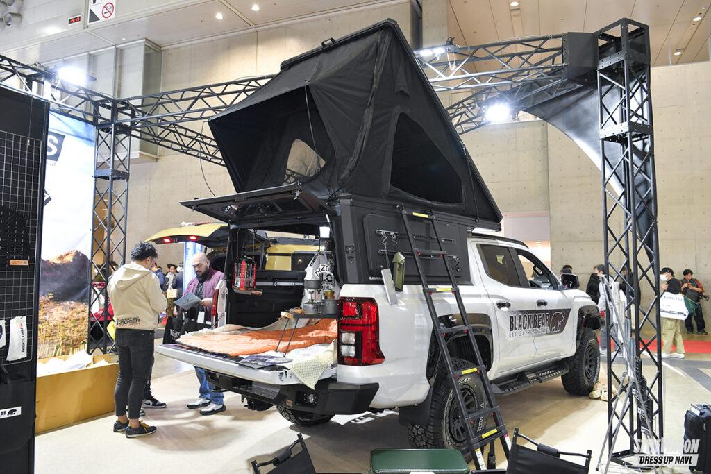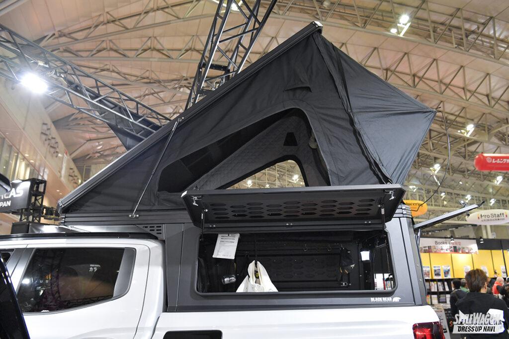 そんななかでも最大の注目は、その荷台に。荷台の上に追加することで、空間を有効活用できる、「キャノピー」と呼ぶアルミ合金製のボックスパーツを用意しているのだが、見過ごせないのがポップアップと呼ばれる格納式テントを上部一体型としている点。荷台を汚れから守るだけでなく、一般的なトノカバーよりも格段に物を詰め、さらに居住空間としての実用性も高いこの新製品。「キャノピーとテントが一体となっている商品は、かなり珍しいかと思います」と担当者。一体ゆえ、例えばキャノピー(荷台)でくつろぎながら、そのまま内部からテント部に上がることができるなど、荷台エリアを完全な秘密基地状態とすることが可能。現在専用オプションもいろいろ開発中とのことなので、用途にあわせ拡張させて楽しめそうだ。
