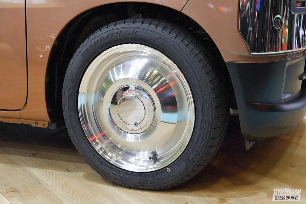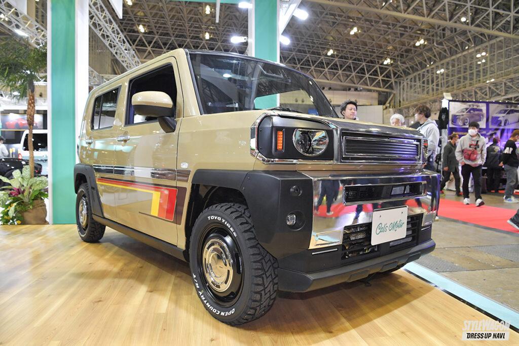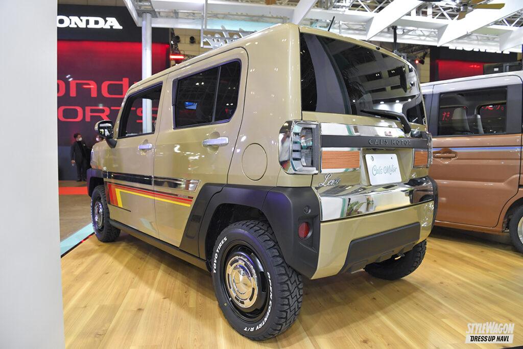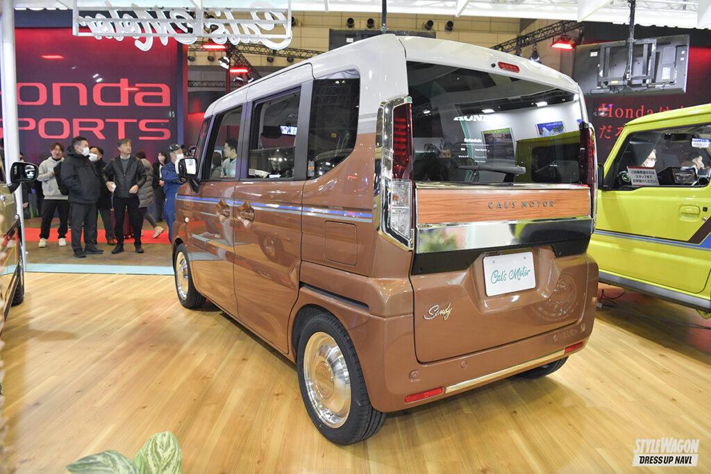 新作は両車ともに、バンパーやグリルにメッキをあしらったキャルズモーターらしい煌びやかでポップな仕様。印象を大きく左右するヘッドライトを、丸目と角目の2種類から選べるほか、リアバンパーやテールレンズにメッキガーニッシュ、立体エンブレムを用意。それらを1つのセットパッケージとして販売するのが、今回のボディキットラインだ。