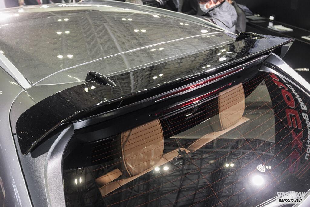 エクステリアは好評なCX-60の流れを汲みながら、躍動的かつ上質感が漂うピアノブラック仕様で統一。サイドアンダースポイラーやリアルーフスポイラー、アクセント効果バツグンなリアサイドカウルなどはCX-80専用で設計し直されている。いずれのエアロパーツも純正のシルエットをリスペクトしつつ、ボリューム感とスポーツ感とをさらに高められるフィニッシュとなるのが特徴。フューエルキャップカバーやカーボンナンバーフレームなど、手軽に使えるサブアイテムが豊富にそろうのも大きなポイントだ。