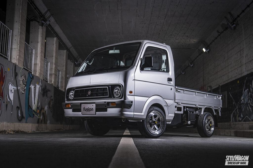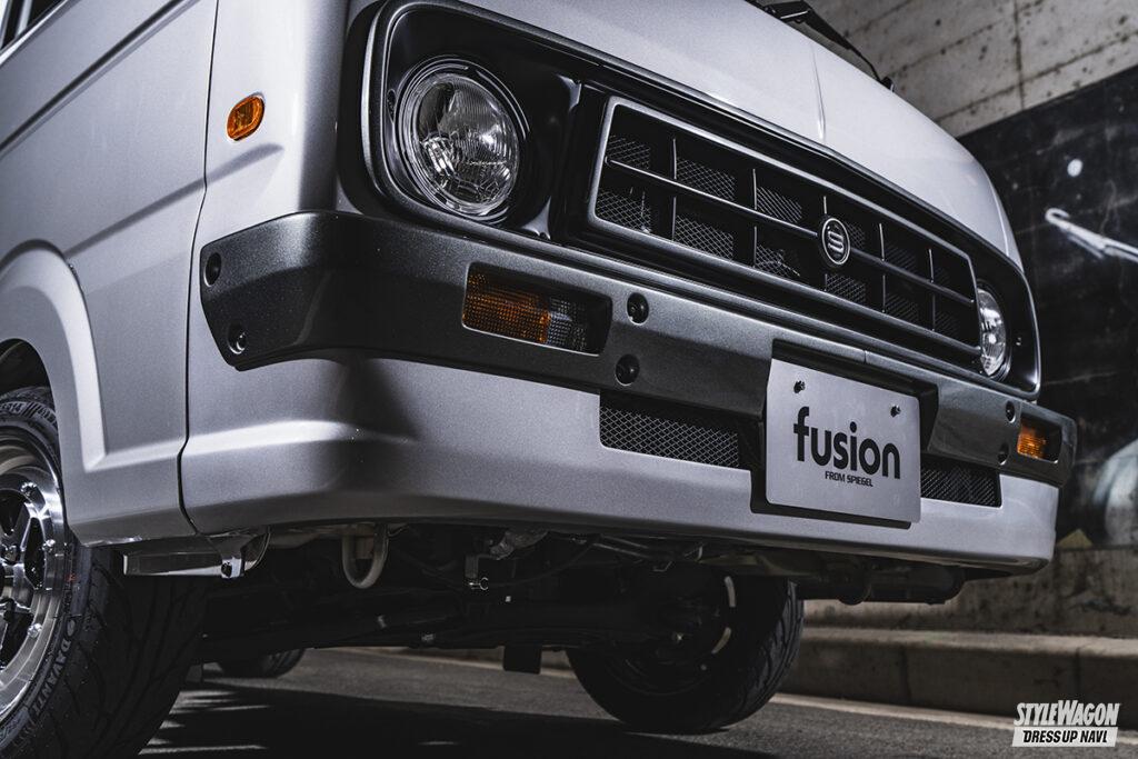 これまでフュージョンは軽トラに限らず表情をガラッと変えるバンパーを発売してきたが、あくまでもヘッドライトなどの灯火類は純正を生かすのがセオリーだった。しかし最新作のDA16Tキャリイトラックに関しては、フロントマスクの印象が大胆に生まれ変わるフェイスキットとしてリリース。
