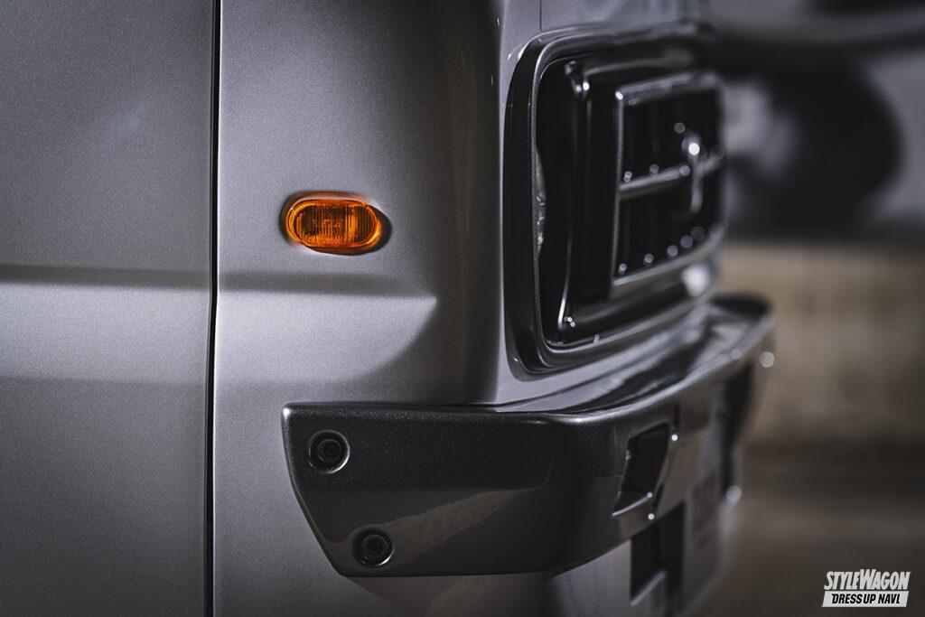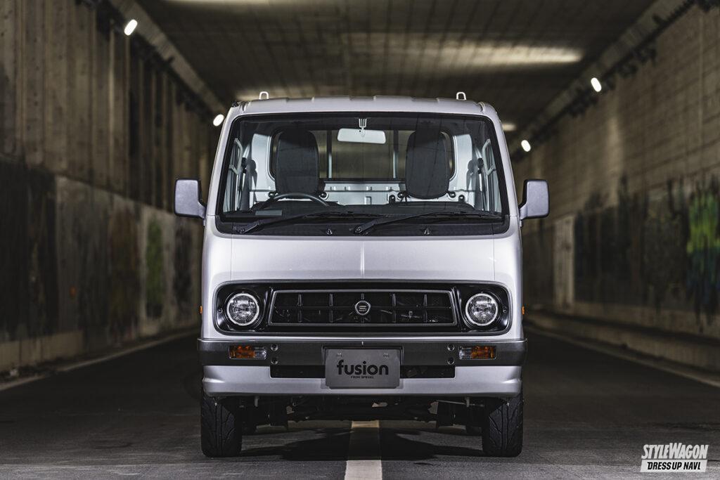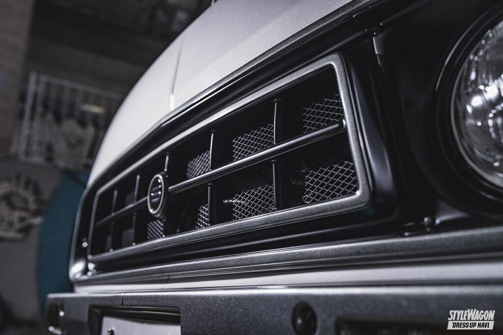 モチーフはレトロな名車、日産サニー。2代目のB110、もしくはマイナーチェンジを繰り返しながら平成初期まで生産されたサニートラックを彷彿とさせる顔つきで、大きなライトを持つキャリイのイメージをおもむろに払拭する。キャリイ自体はスズキから販売されている軽トラだが、日産にOEM供給してクリッパートラックの名で販売されているだけに、意外にも親和性が高い。純正のライトにとらわれることがないフェイスキットを採用しただけあり、実車のサニーにも採用されるボンネットのプレスラインをはじめ、可能な限り雰囲気を再現している。しかもスマートな仕上がりを実現するべく、バンパーやライトベゼルを別体で製作。これにより塗り分けが容易となり、よりクオリティの高いサニーフェイスが手に入る。