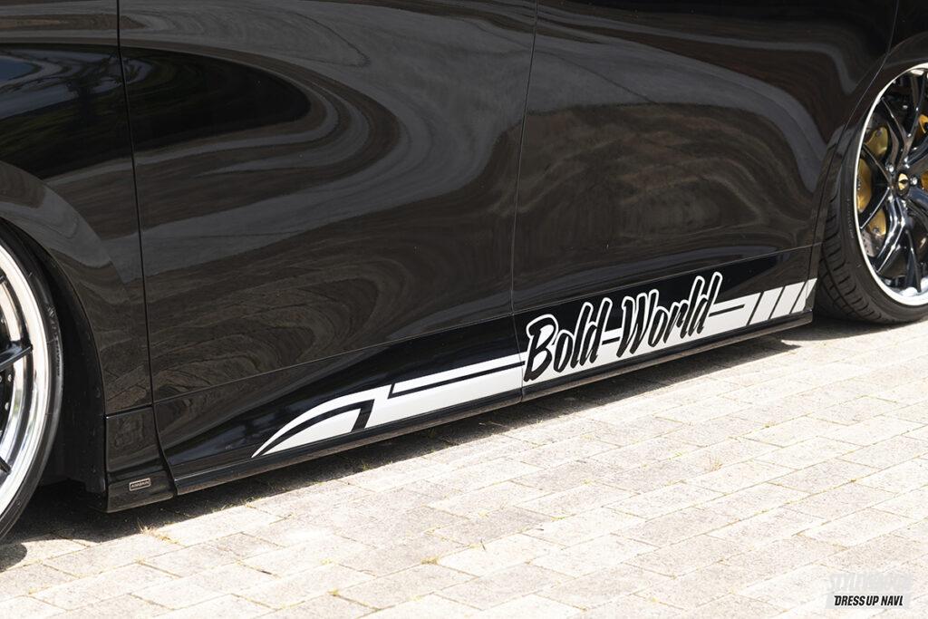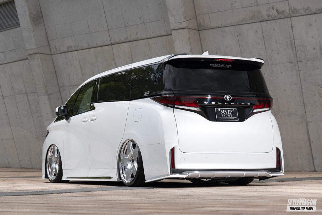 セダンやミニバン、さらに高級外車まで幅広くエアロを手掛けるエイムゲインは、クルマのキャラにあわせシリーズを分けて展開中。アルファードは上質系の「純VIPエグゼ」から、ヴェルファイアは走りを意識した「純VIPスポーツ」からとなり、両者はともに必要最小限のリップタイプだ。前者が落ち着きのあるシンプル系である一方、後者はフロント等の端にカナード風のフィンを盛り込んで走り系に振るなど、似て非なる仕様となる。