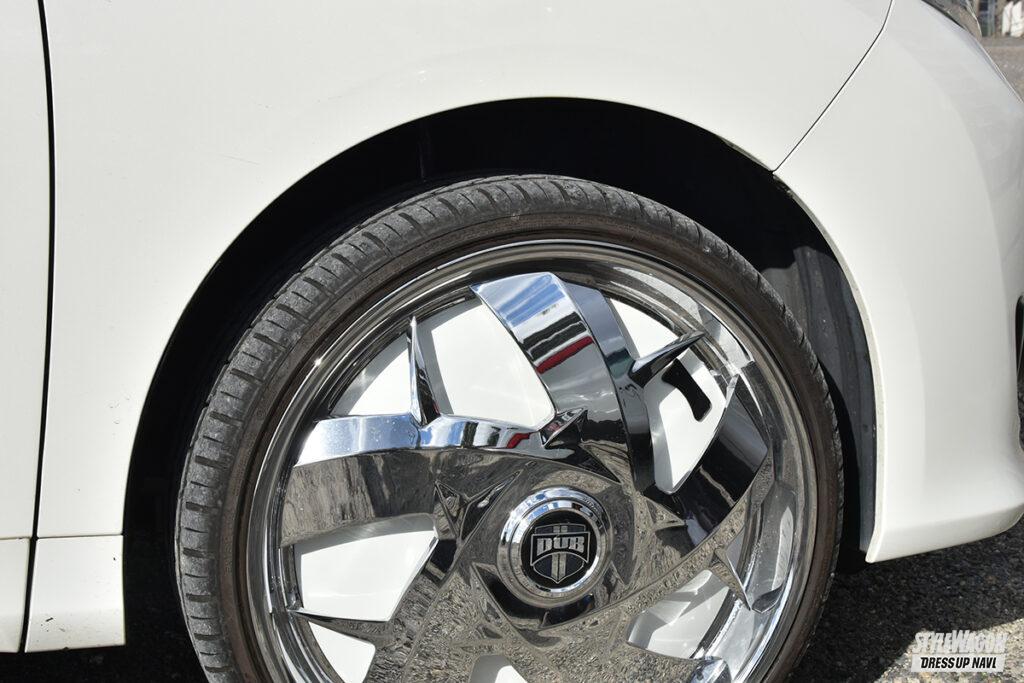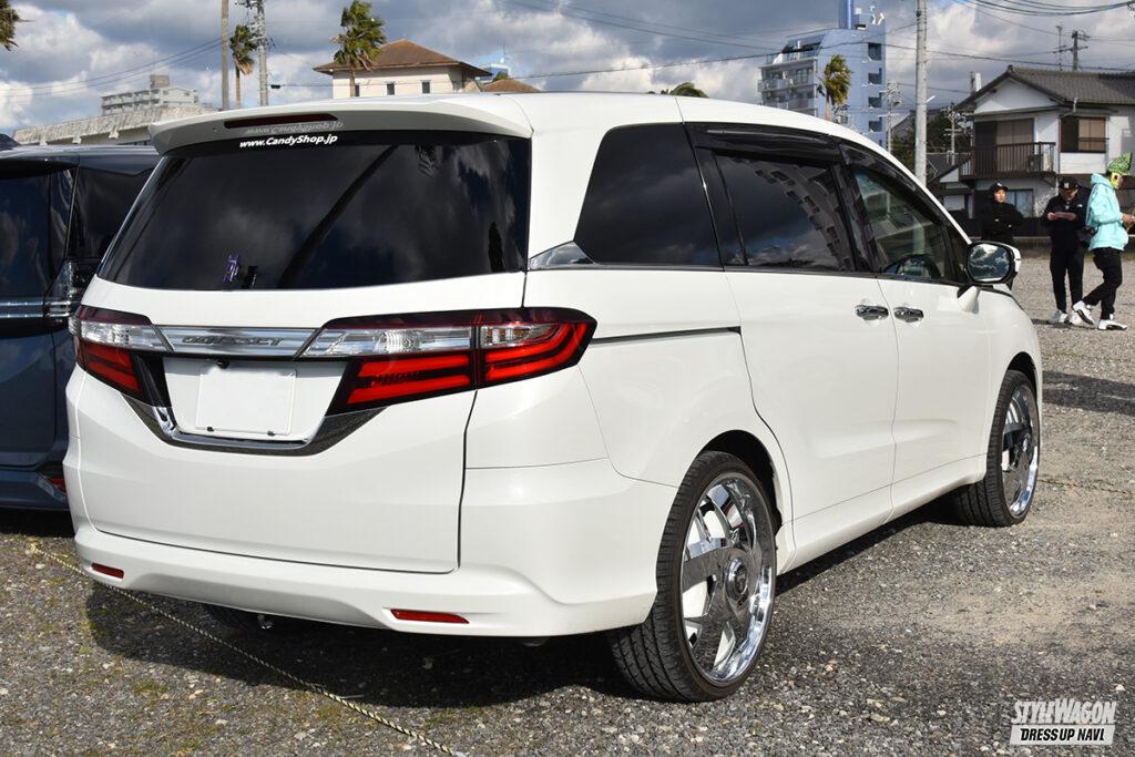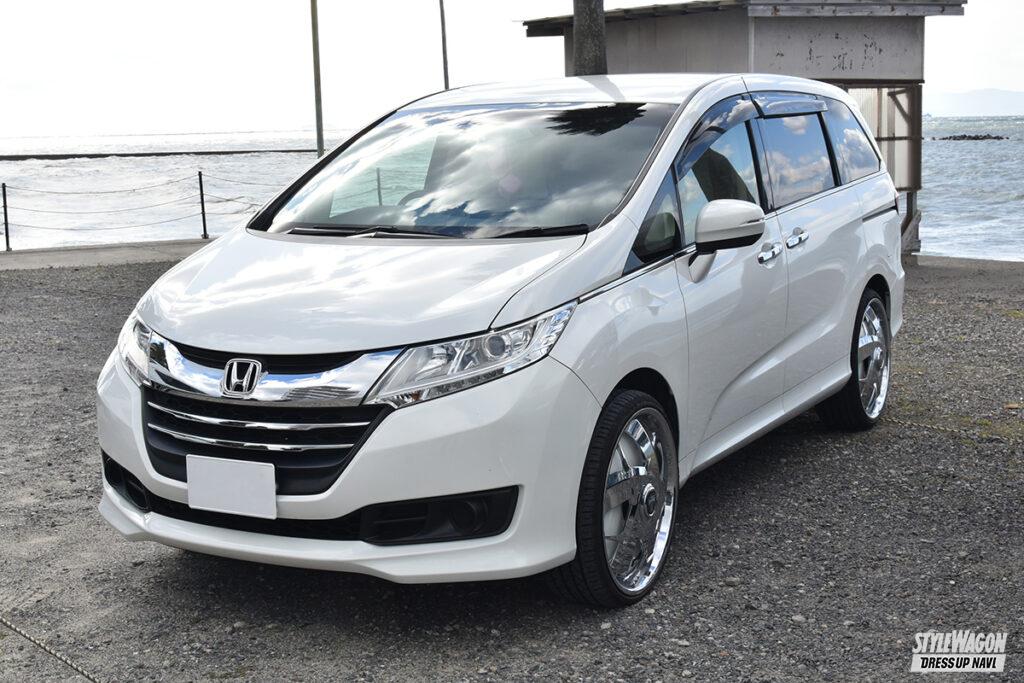 「Jラグを意識してカスタムしています」と、購入半年の真新しいRC1オデッセイのカスタムに着手した早川さん。まずはショックをワンオフ加工することで車高を約20〜30㎜リフトアップ。その足もとにはキラキラしたフローター付きDUBホイール(22×8.5J)をセット。今後はピンストライでさらに進化する!?