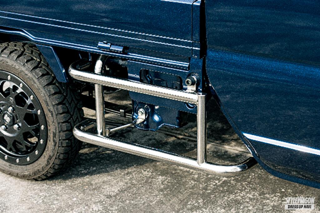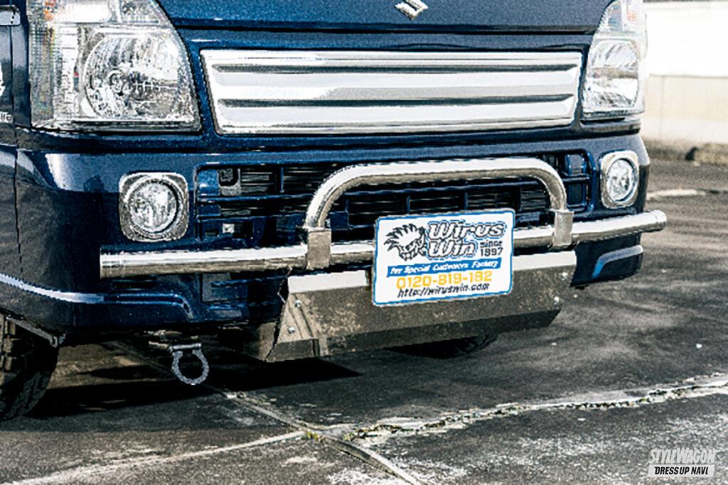 最近は軽トラの武骨で男らしいスタイルをより引き立てる、太目のパイプ径を使ったインパクト重視のアイテムも次々とラインアップ。定番のマフラーを含めて、幅広いアイテム群でユーザーニーズに応えてくれる。
