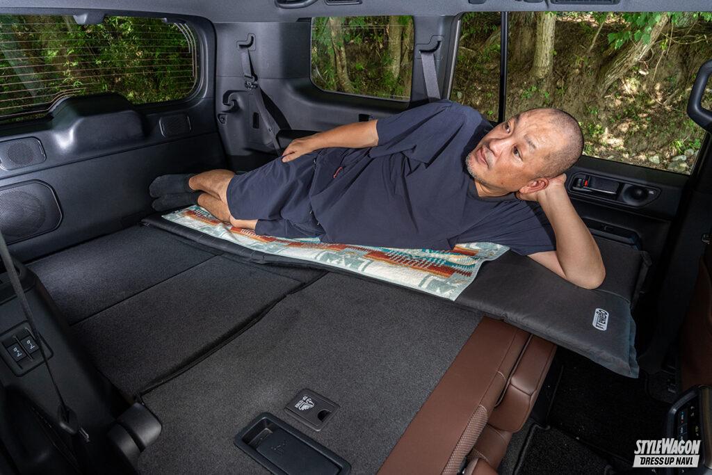 ランドクルーザーで車中泊する場合、ラゲッジ+後席を格納して就寝スペースを作るのがスタンダードな方法。前回、前々回で車中泊した「70」と「300」も同じ手法で就寝スペースを作ったが、身長170cmの大人は普通に寝転ぶことができなかった。クルマのボディサイズを考えると余裕で寝られると思っていたが、実際は荷室スペースを斜めに使用するなどちょっとした工夫が必要。しかし今回の「250」は、驚くほど快適な一晩を過ごすことができた。