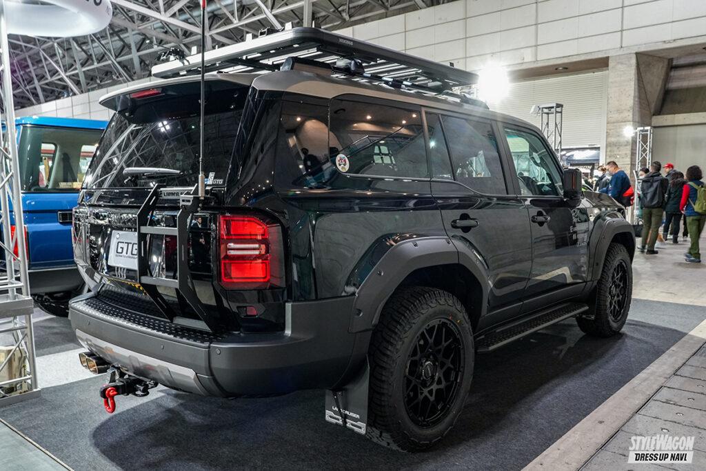 黒樹脂パーツを引き立たせたランクル250が目立つなか、あえてブラックの純正色をチョイスして黒づくめのシブいルックスで差別化を図ったGTG群馬トヨタのデモカー。20mmワイドのジャオスのフェンダーガーニッシュで収めた20×9Jの足元もレイズM8の特別仕様“ブラックエディション”にこだわり、ヨコハマのオールテレインタイヤ「ジオランダーX-AT」の275/60のタイヤチョイスも街乗りメインのスタイルをアピール。ボンネット先端のバグガードやヤキマのルーフラックなどアメリカ物の実用アクセサリーも、ヘビーデューティ系と被らないカジュアルな個性を醸し出している。