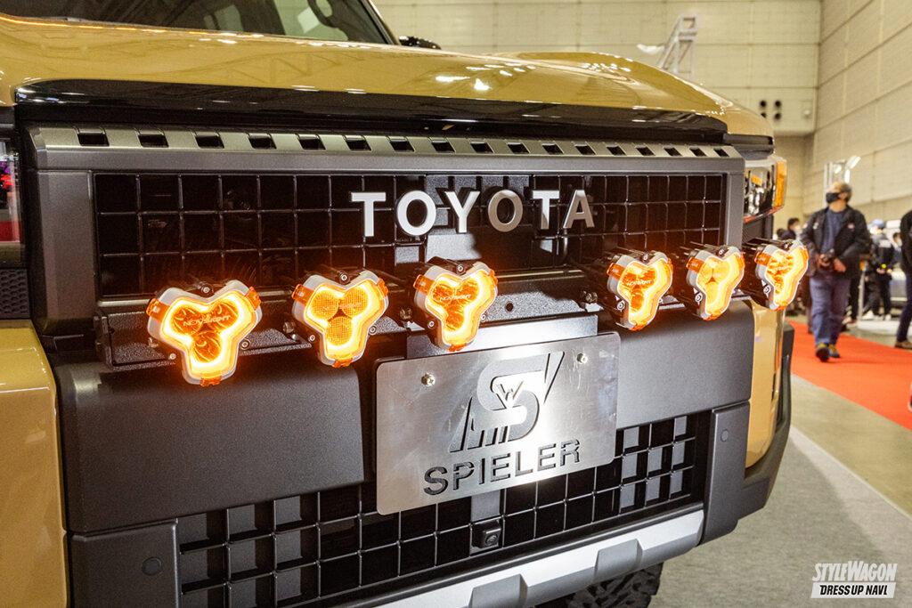 「車両製作のコンセプトはオフロードスタイルです」。シュピーラーのランクル250は後付けライトやルーフラックでガッツリとカスタムを施した1台だ。最大の見所はやはり足まわり。リフトアップを行い、大径タイヤを履かせているにもかかわらず乗り心地が良い、というのがこだわりだという。使用しているキットはアメリカのデザートレースでも非常にポピュラーな“キングショック”。加えて、リンク類も交換するなどして、今の車高を実現している。なお、フェンダーは敢えての純正状態。そのために、タイヤも大径でありながらナロータイプを履いているという。ちなみに、サイドステップやルーフラックはシュピーラーのオリジナルアイテム。実用性とカッコよさを両立させた、機能性パーツだ。