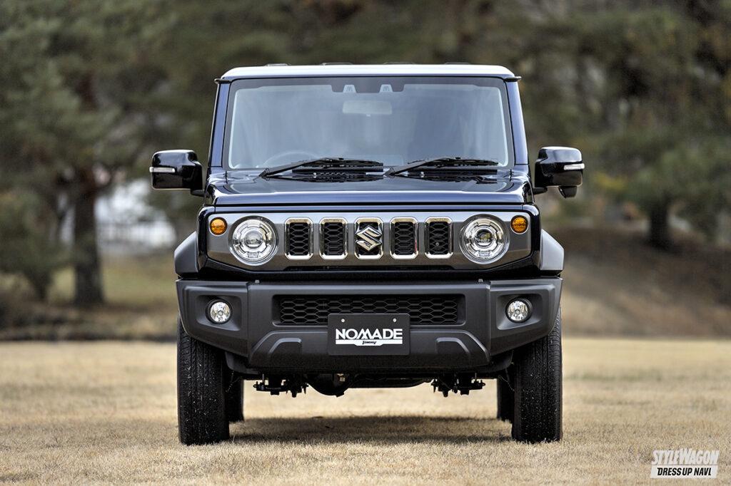 外観にはメッキ加飾を施した5スロットグリルをノマド専用デザインとして採用。ジムニーの最上級モデルとして位置付けられるため、フェイスをメッキ化することで、見た目以上の高級感を手に入れた。