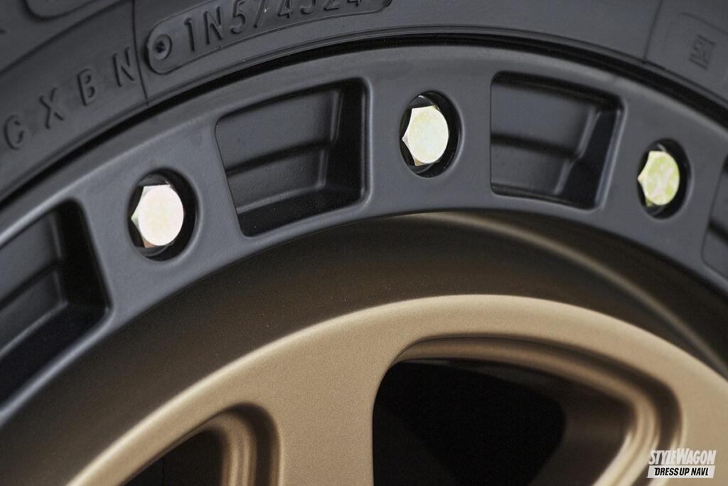 デザインのベースはシンプルなディッシュ。8つのスクエア窓とギア感の強いセンター部、奥行きを生み出すコンケイブフォルムといった最旬の造形が随所に取り入れられるのが魅力的だ。リムフランジにはブランドのDNAでもあるリアルビードロックスタイルを導入。ボルトとディンプルとを連ねたいかにもオフローダーらしいデザインが雰囲気を盛り上げる。