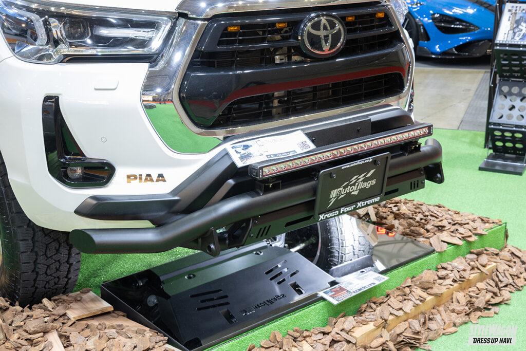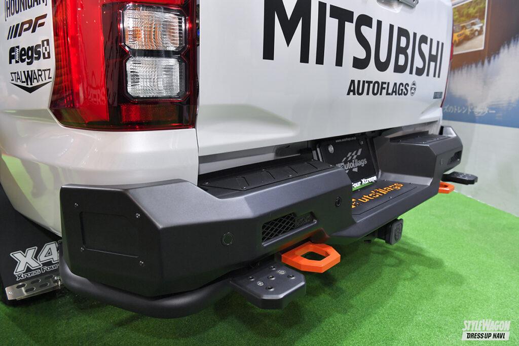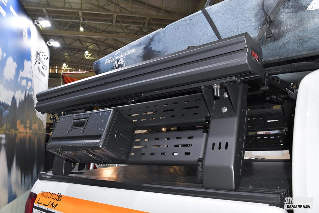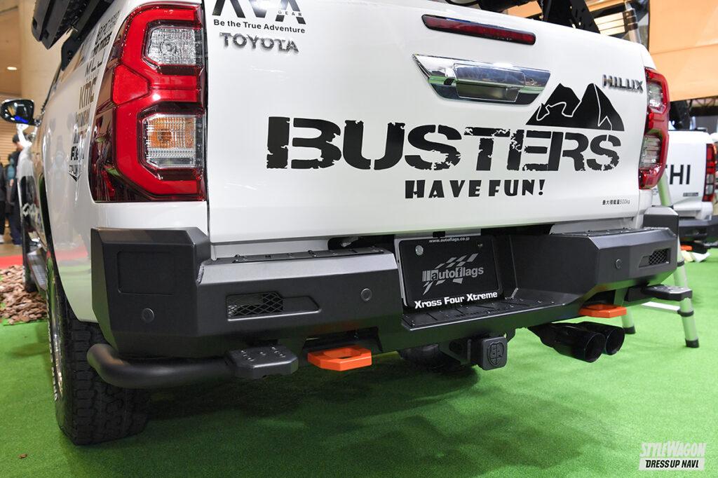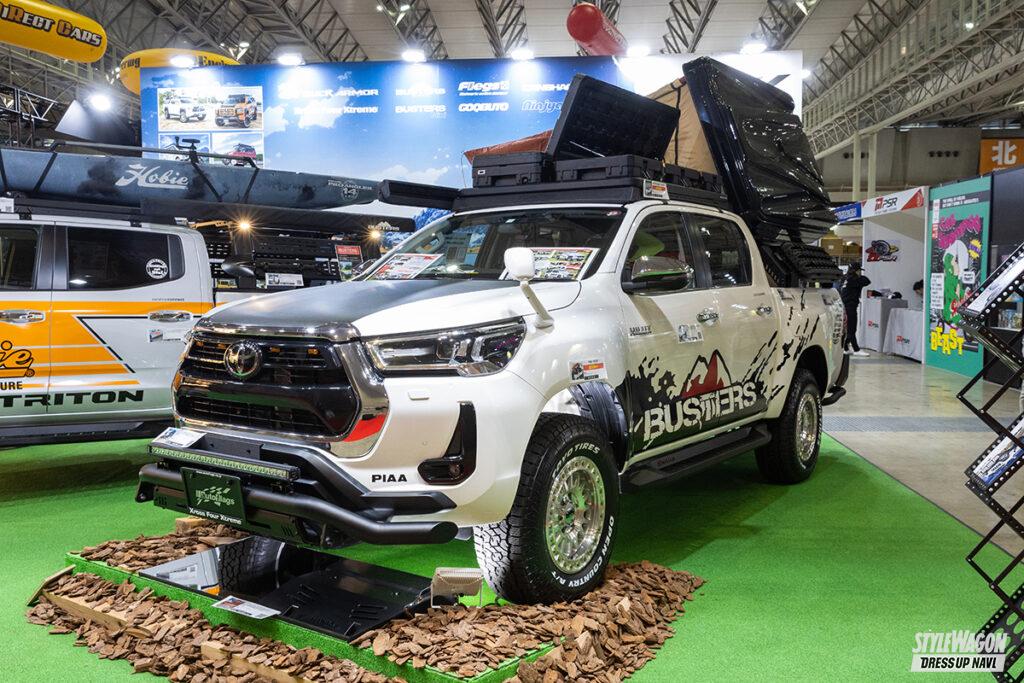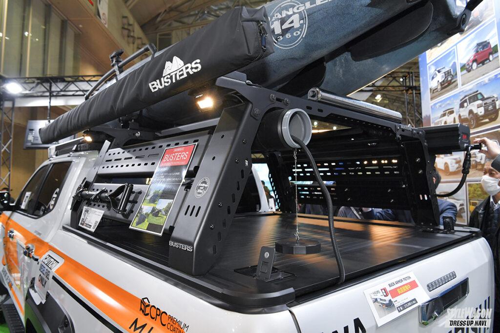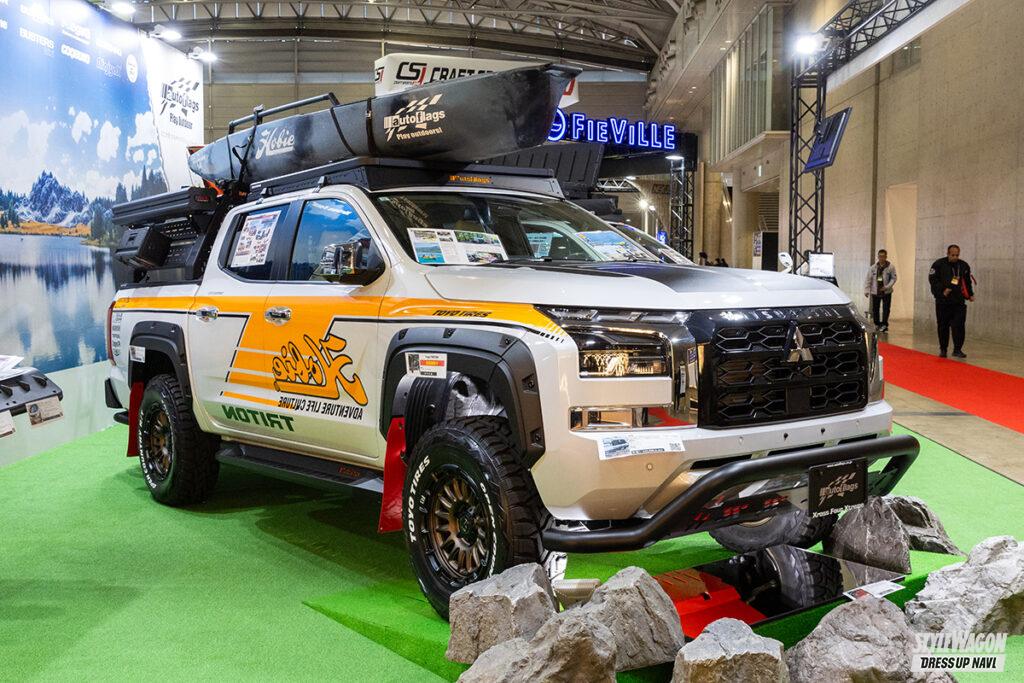 デリカカスタムで広くその名を知られるオートフラッグスは、今後ますます需要が高まると予想される2台のピックアップで話題をさらった。トライトン、ハイラックスともに、GOQBUTO(ゴクブト)の名で知られるフロントガードや、リフトアップ車には効果テキメンといえるアンダーガード、実用度大のルーフラック、用途に応じて選べるベッドラックなどでカスタム。サイドステップやバックアーマーと名乗るリアバンパーなど、ゴツいスチールパーツもふんだんにありと、判りやすいアクティブさが魅力的だ。リザーバータンクの有無を選べるモノチューブダンパー「アイアンレッグス(仮)」もあわせて実装と、話題に事欠かず。