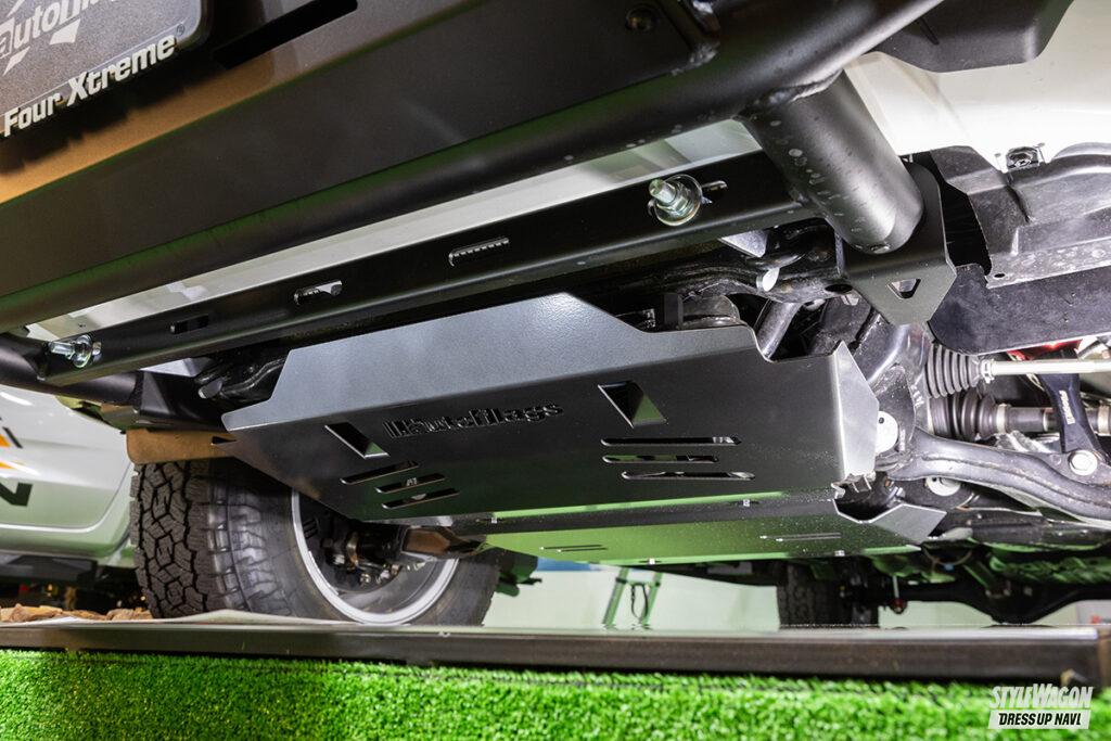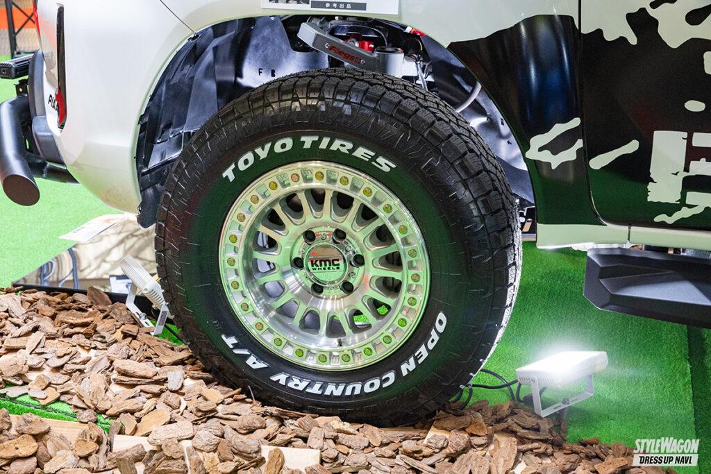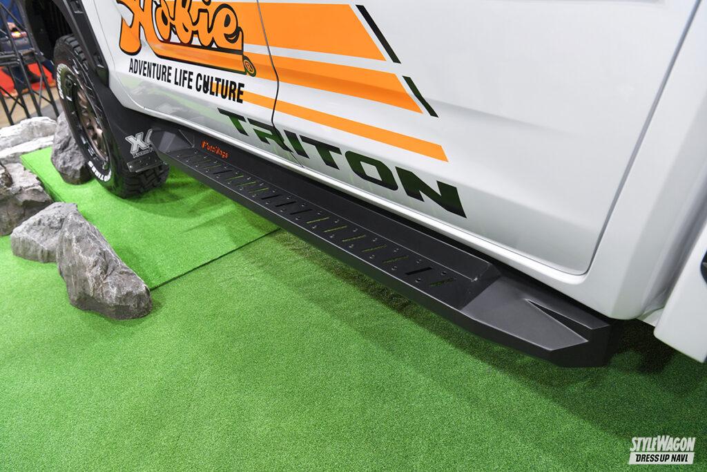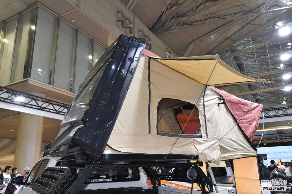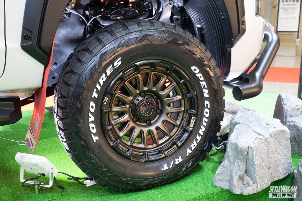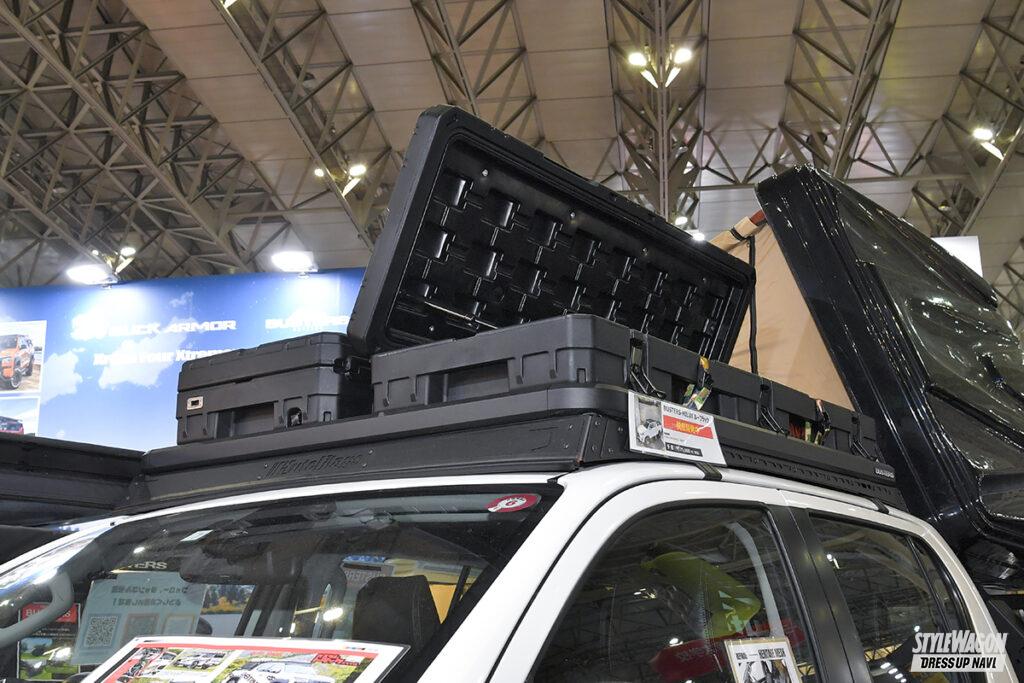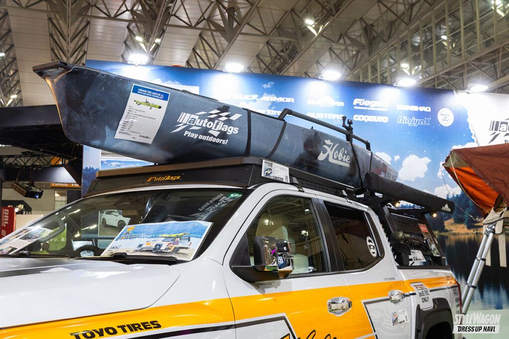 デリカカスタムで広くその名を知られるオートフラッグスは、今後ますます需要が高まると予想される2台のピックアップで話題をさらった。トライトン、ハイラックスともに、GOQBUTO(ゴクブト)の名で知られるフロントガードや、リフトアップ車には効果テキメンといえるアンダーガード、実用度大のルーフラック、用途に応じて選べるベッドラックなどでカスタム。サイドステップやバックアーマーと名乗るリアバンパーなど、ゴツいスチールパーツもふんだんにありと、判りやすいアクティブさが魅力的だ。リザーバータンクの有無を選べるモノチューブダンパー「アイアンレッグス(仮)」もあわせて実装と、話題に事欠かず。