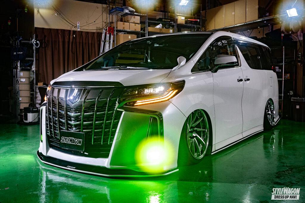 エアサスによる圧倒的なローフォルムと、内外装の見映えする光の演出が印象的なEitoさんのアルファード。オーナーがこだわったのは、ファミリーカーとしての使い勝手。前席背後、2列目足元にワンオフのボックスを作り込んだが、実はコレ、前席のスライド&リクライニング機構を損なわない形状なのだ。しかも家族が足をかけることを前提にカーペットも敷いている。ラゲッジのボックスもボードをセットすれば、荷室としての機能をしっかりと果たす。「カスタム仕様なんだけど、ちゃんとファミリーカーとして使えるように」を具現化している。システムはダイコックにこだわり、アンプ、スピーカー、ウーファーはすべて統一。4台のアルヴェルを乗り継いできたオーナーだが、そのうち3台はすべてダイコックをインストールしてきたという惚れっぷりだ。