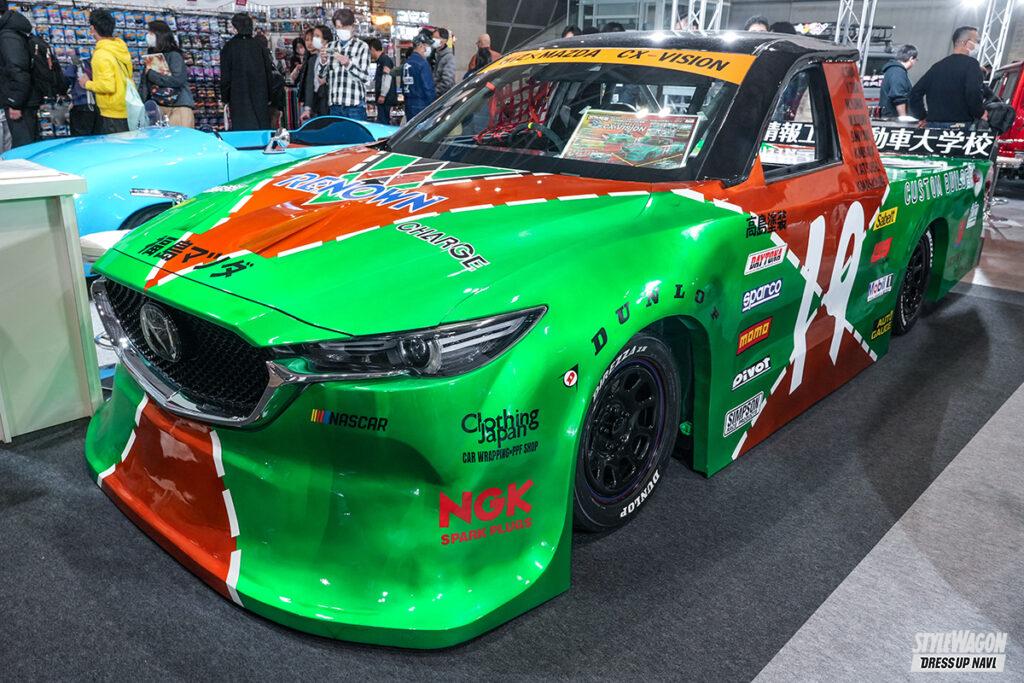 福島の国際情報工科自動車大学校の学生有志による「WiZカスタムビルダース」の作品は、マツダCX-5ベースのNASCARレースマシン風ピックアップトラック! ベース車両の原型を留めているのはフェイスのみで、フロントフェンダーからテールエンドにかけてはFRPワンオフのボディワークで全幅40㎜ワイド化とリアオーバーハングをストレッチ。MLJデイトナSSの17インチを履く足元にはエアフォースのエアサスをインストールし、極限のローフォルムでキメまくりだ。