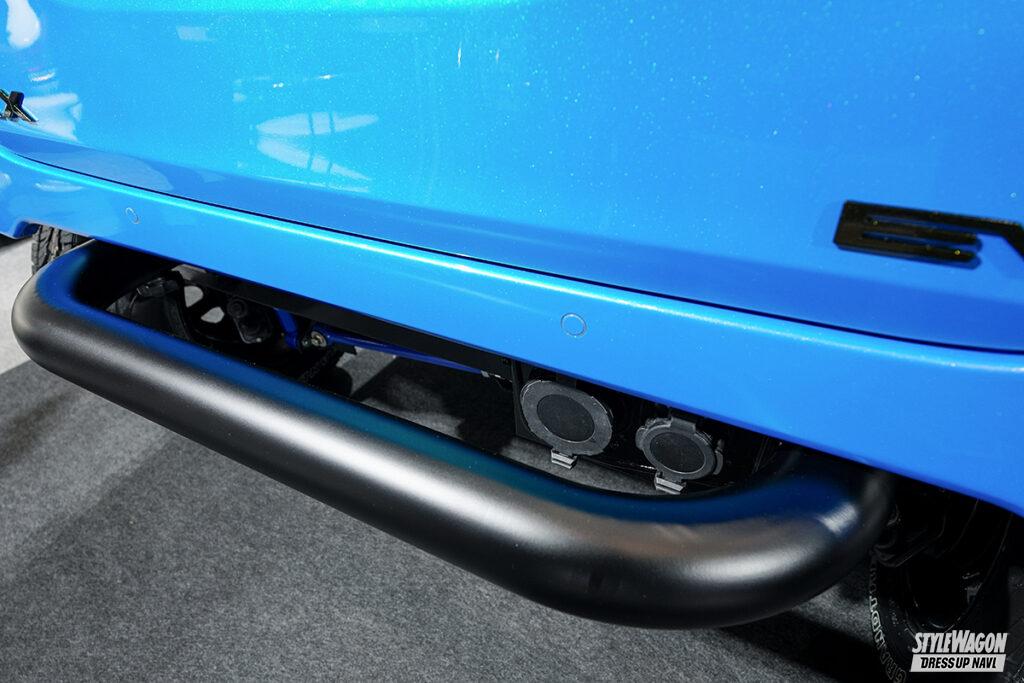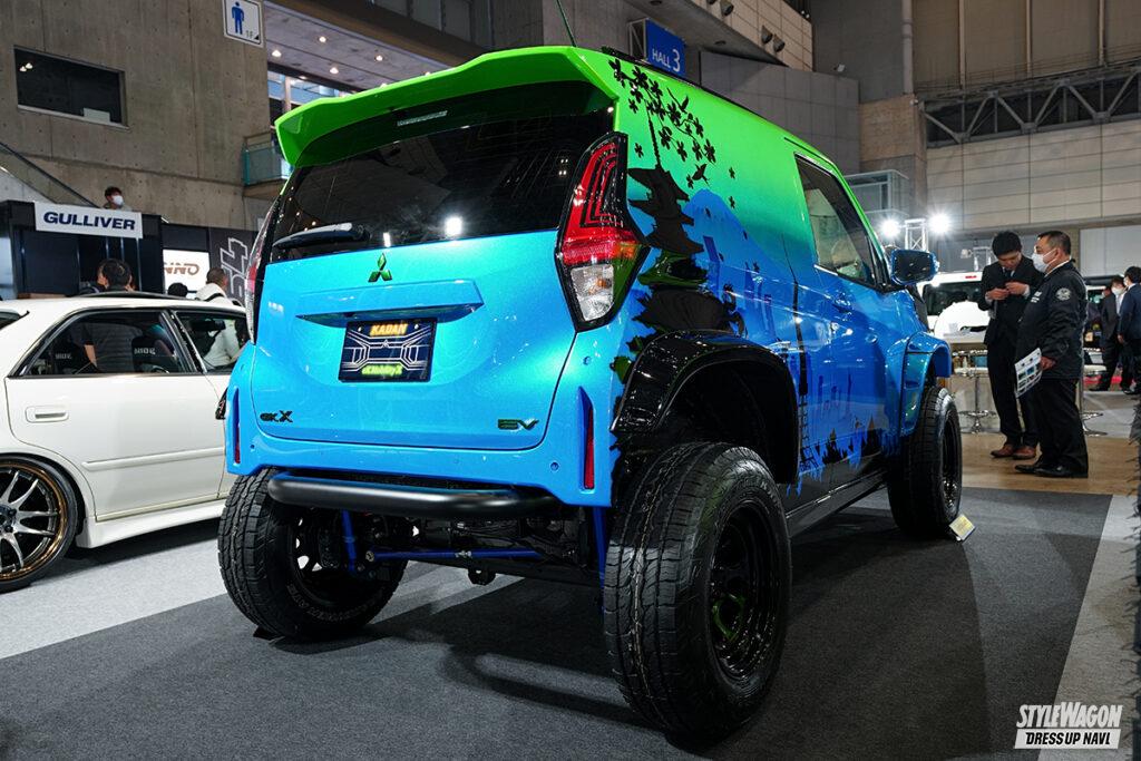 1、2級整備士、鈑金塗装のスペシャリストを輩出する花壇自動車大学校の生徒たちが作り上げたのは、近未来と過去のミックスをテーマに据えたeKクロスEV。エアブラシによるグラフィックは東京タワーとスカイツリー。光の加減で色味がわかるエキショウによる塗装等々、そのテーマに則った仕様と言えよう。ユニークなのは大径タイヤを履くため、給電口を移設した点。リアに移設したが、極太のガードバーを着脱式にしたことで、充電もスムーズに行える!