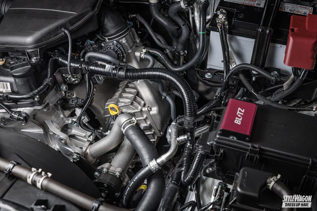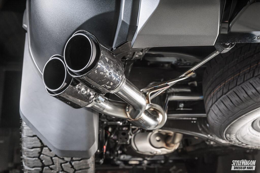 「車高調」こそ全車対応となるものの、マフラーと過給器は“ガソリン車”専用を謳っている点が1つのポイント。「グレード体系の主役はディーゼルですが、ガソリンと比較すると車両代が高額ぎみ。ガソリンをベースに、浮いた車両代をパーツに投資し、ディーゼルのパワフルな走りに近づけてお楽しみ頂ければ」という想いから選んだ、あえてのガソリン車での開発となっている。