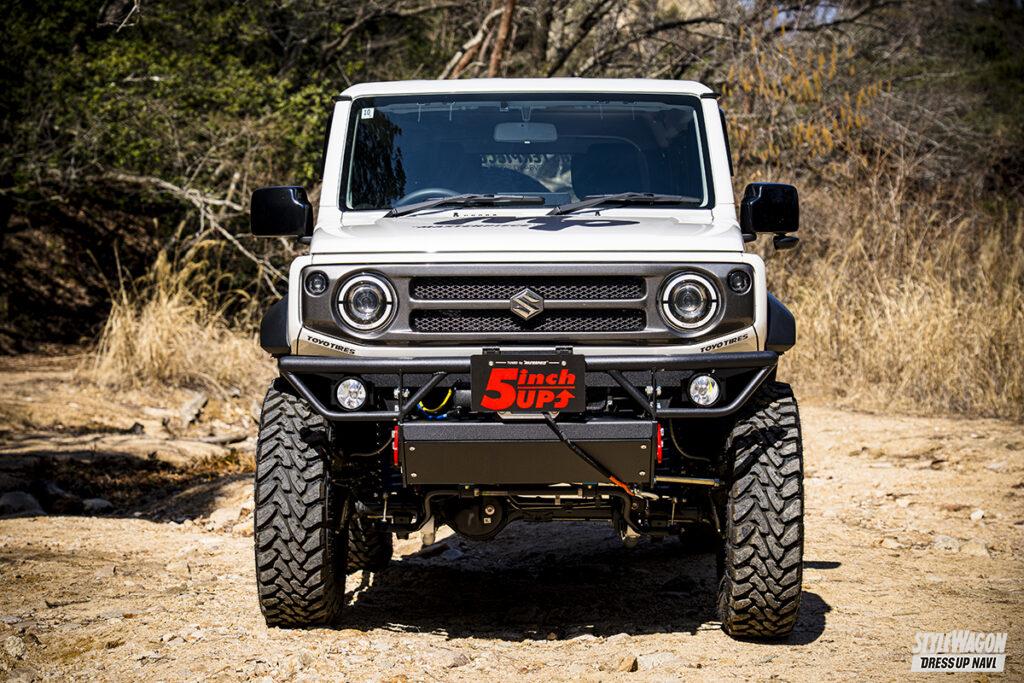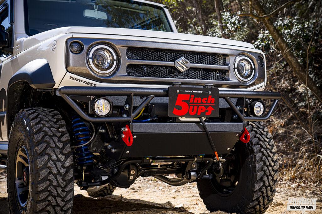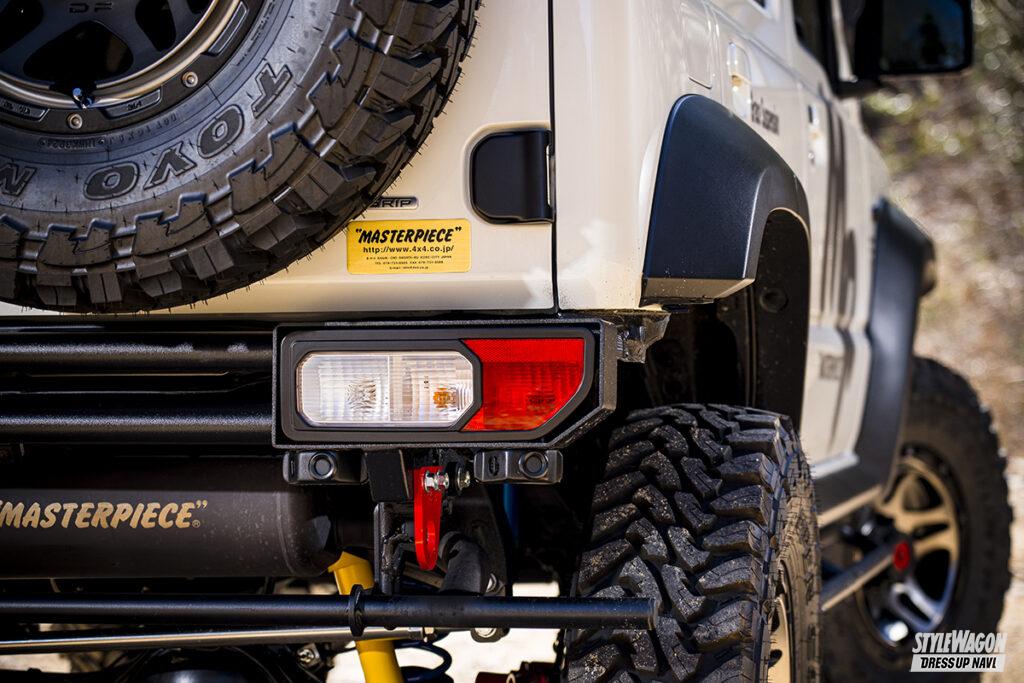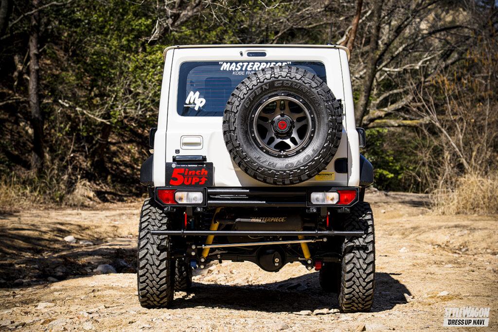 マスターピースは足回りからチューニング、内外装までジムニーを丸ごとカスタムできるジムニー乗りにはおなじみのプロショップ。そんなマスターピースが5ドア・ノマドの発売前に、インド仕様の5ドアを購入し速攻でカスタム。マスターピース奥原店長によれば「インド仕様の5ドアなので、追突防止装置などの安全装備やドアミラーなどの違いはありますが、基本的にシエラ用のパーツが使用できます。もちろんボディがシエラより全長&ホイールベース共に340㎜、室内超は115㎜5ドアの方が長いので、ボディの長さに関係するサイドステップなどは専用品が必要になってきます。また車重が100㎏増えていてブレーキもフロントはベンチレーテッドディスクになっているので、サスペンションとブレーキも専用品が必要ですね」。