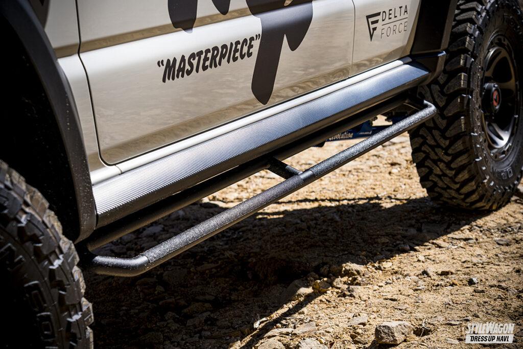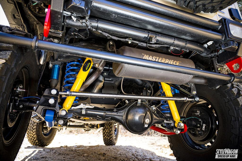 そのあたりを考慮してマスタピースがまず取りかかったのが、サスペンションキット。シエラ用キットをベースにノマド用の5インチアップキットを開発。アーム類はシエラ用の流用でOKだが、スプリングとショック、ステアリングスタビライザーは専用品を開発している。今回のデモカーには5インチアップキットと235/85R16マッドテレーンタイヤを装着。かなりハードなオフ仕様の見た目だが、オンロードでの乗り心地も快適。オフロードではオリジナルのサスペンションキットのおかげで「よく動く」足を実現。大人4人が快適に乗車できるファミリーユースのノマドながら、オン/オフ共におまかせの仕様となっているのだ。