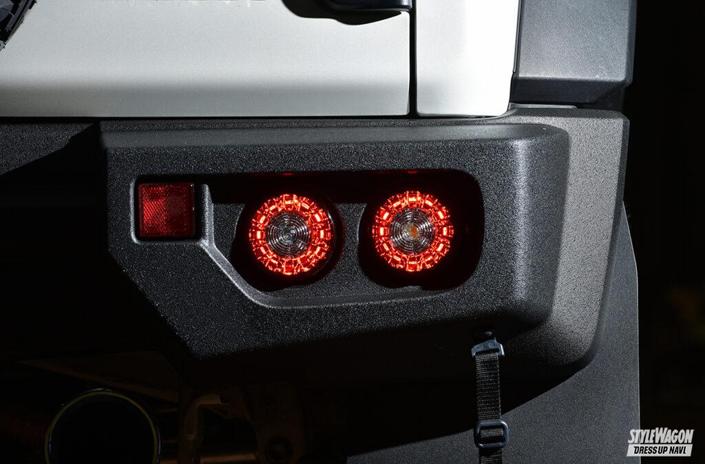 まずシエラは純正オーバーフェンダーによるワイドフォルムを、軽やかでアグレッシブなスタイリングへと進化させる。純正バンパーと交換する前後のスポーツカウルは、クロスカントリービークルをイメージしてスソを大胆に切り上げ、下回りを軽快に見せてくれる。リアはジャオスオリジナルの丸型LEDテールランプを採用して、シエラのリアビューを大きくイメージチェンジ。