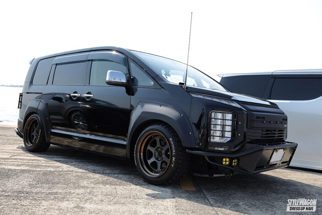 キャンプに行きだしたことで、D:5に乗り換えたやんちゃんさん。元々クルマをイジるのは好きだったが、当初は「タイヤ、ホイールくらい」しか換えていなかったそう。しかしグリルを換えた辺りで火が点いてしまい……。タフな方向性で仕上げているが、当ホイールに換えるのを機に「下げた方が良いかも」と思うように。そして実際、純正比11cmのローダウンを敢行! 各所にガードがあり、フェンダーもタフネス路線。しかしストリート、スポーティなテイストをも醸し出すことに成功したのである。しかし車高を下げたが故に「キャンプ場に入れなくなりつつあります」とも話していた。