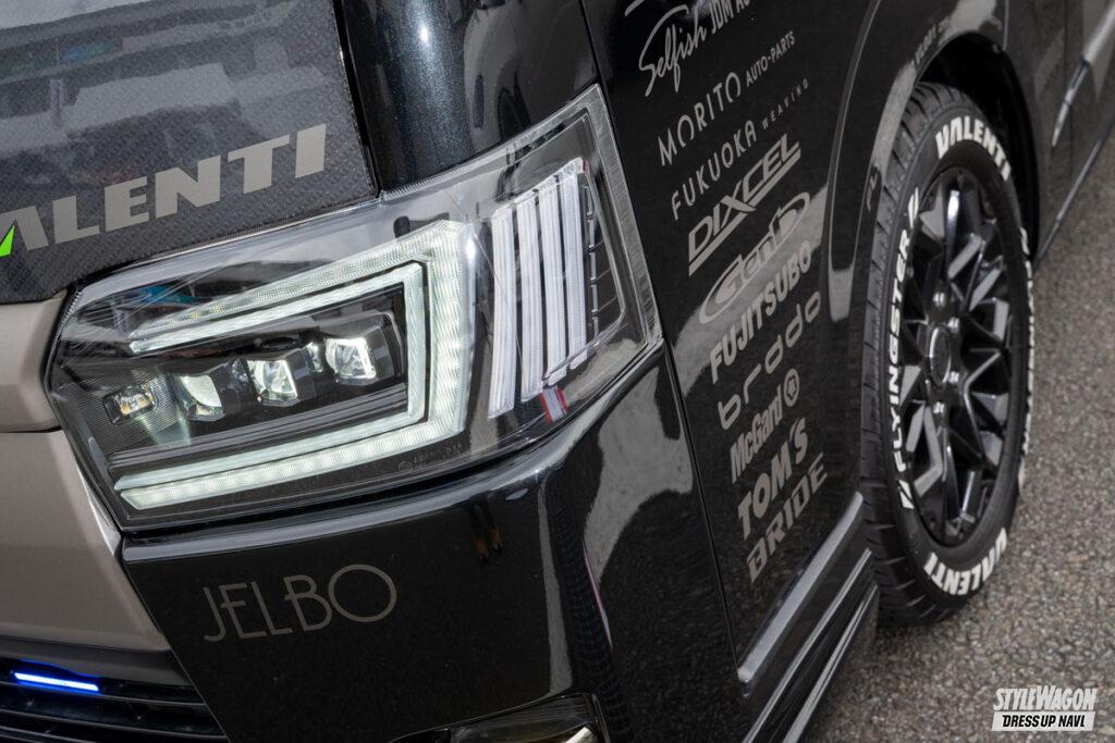 ブース前に展示されたハイエースのトピックは、東京オートサロン2024で発表された「ジュエルヘッドランプULTRA」。同イベントではプロトモデルとしての発表だったが、4月末発売予定の製品モデルを装着してのディスプレイとなり、高輝度LEDを採用する「ジュエルヘッドランプULTRA」の存在感は日中でも注目の的だった。そんな同製品最大の特徴となるのが、200系ハイエースのアフターパーツとしては初となるコーナリングランプの採用だ。レンズ中央にレイアウトされる3眼LEDプロジェクターランプ内側に設置されたのがコーナリングランプで、ウインカー連動、もしくはステアリングの舵角に反応して、ヘッドライトでは照らしきれない広範囲を照らしてくれる。最大4眼(!?)となる目力のアピール力だけでなく、実用面においても高い効果を発揮してくれる。また、コの字型に点灯するポジションライトはウインカーランプとしての役割も担い、配線の接続方法によってシーケンシャル仕様で点灯させることも可能だ。他にも欧州車などに搭載されているオープニン&エンディング機能を搭載しており、ドアロック&アンロック時に、ヘッドランプがモーション点灯する機能も持ち合わせている。すでにハイエース専用のカスタムヘッドランプは様々なメーカーから発売されているが、ここまで多機能なモデルはヴァレンティだけ!!