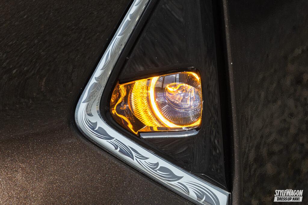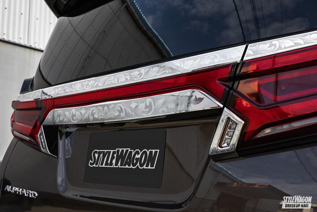 さらにトータルバランスの向上に大きな効果を発揮しているのが、クリスタルアイのファイバーLEDテールランプ。独自の発光パターンに加え、リアウインドウ下段分を一直線に横切るクロームモールは、フードトップモールをスムージングさせたボンネットラインとの相性も抜群。フォルムの重心をより低く見せることで、大地にドッシリと身構えた堂々たる風格を醸し出している。