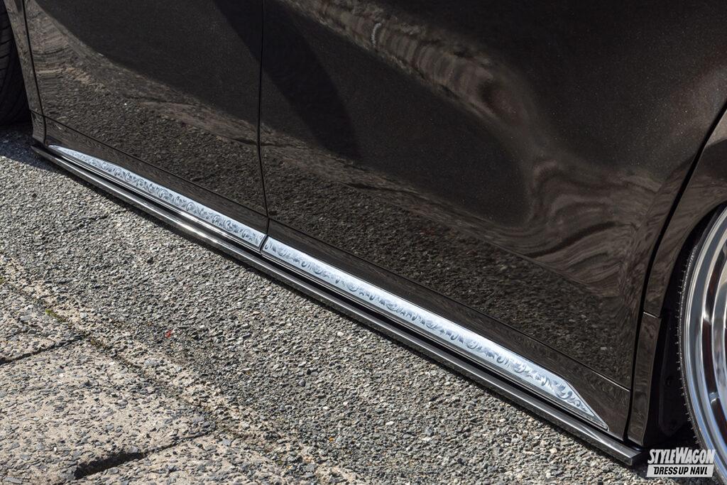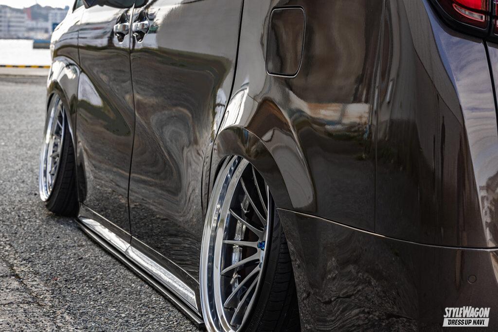 ベースとなったのは後期のS“Cパッケージ”。モディファイにおけるテーマはファミリーカーとしての実用性の確保と、街角で一目置かれるような無二の個性の両立。フェンダーはフロント15㎜/リア25㎜という控えめな範囲内でワイド化。あえてイジった感を抑えるべくアーチの厚みや形状は純正を活かすとともに、前後バンパーをプレーンなデザインのGグレード用に変更する高等テクも。これらの工夫により、ボディサイドの視覚的なボリューム感はノーマルとは別モノに一新!