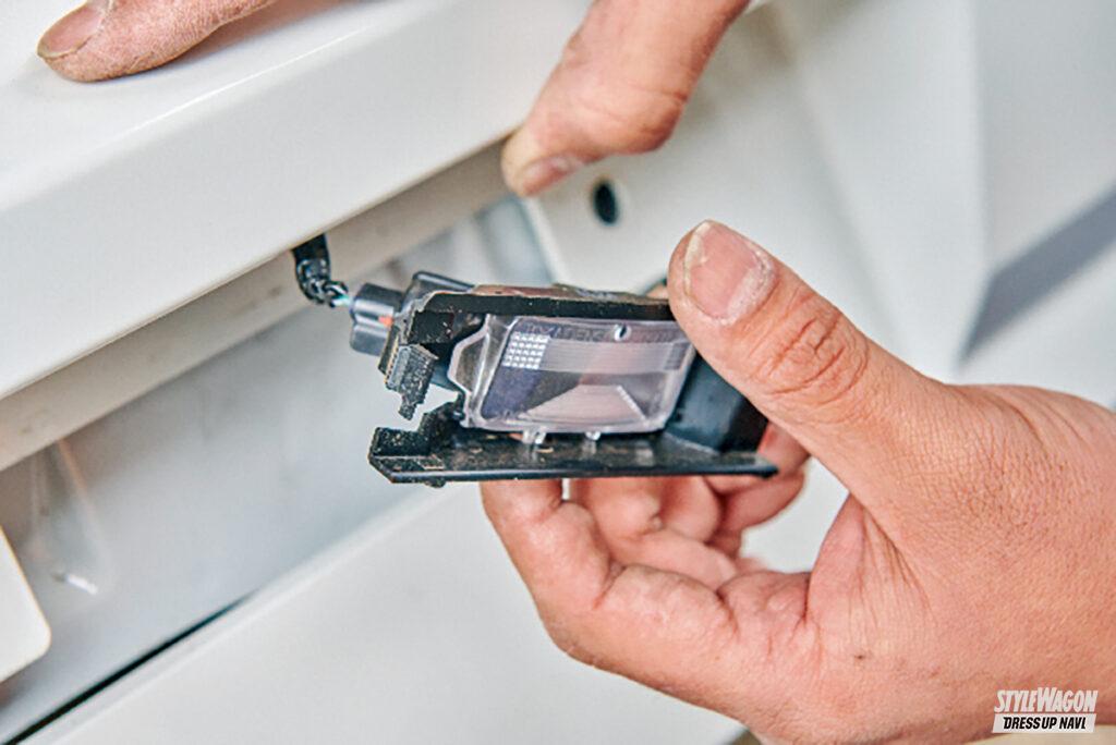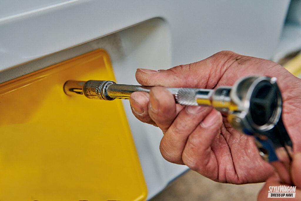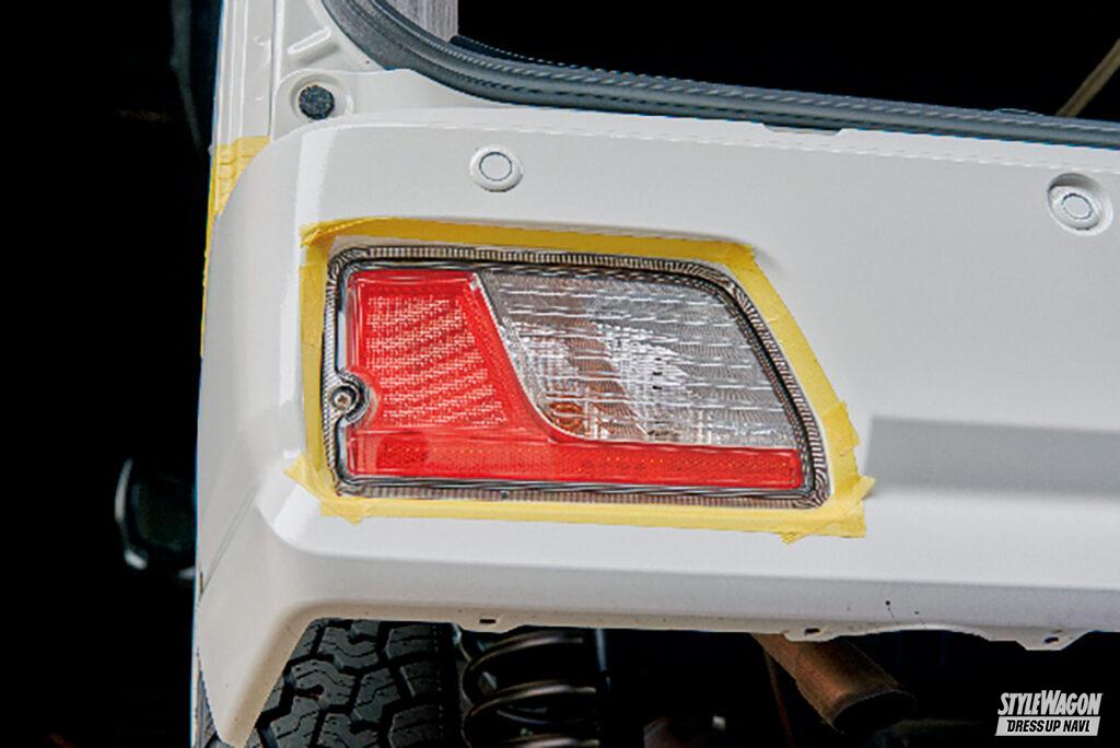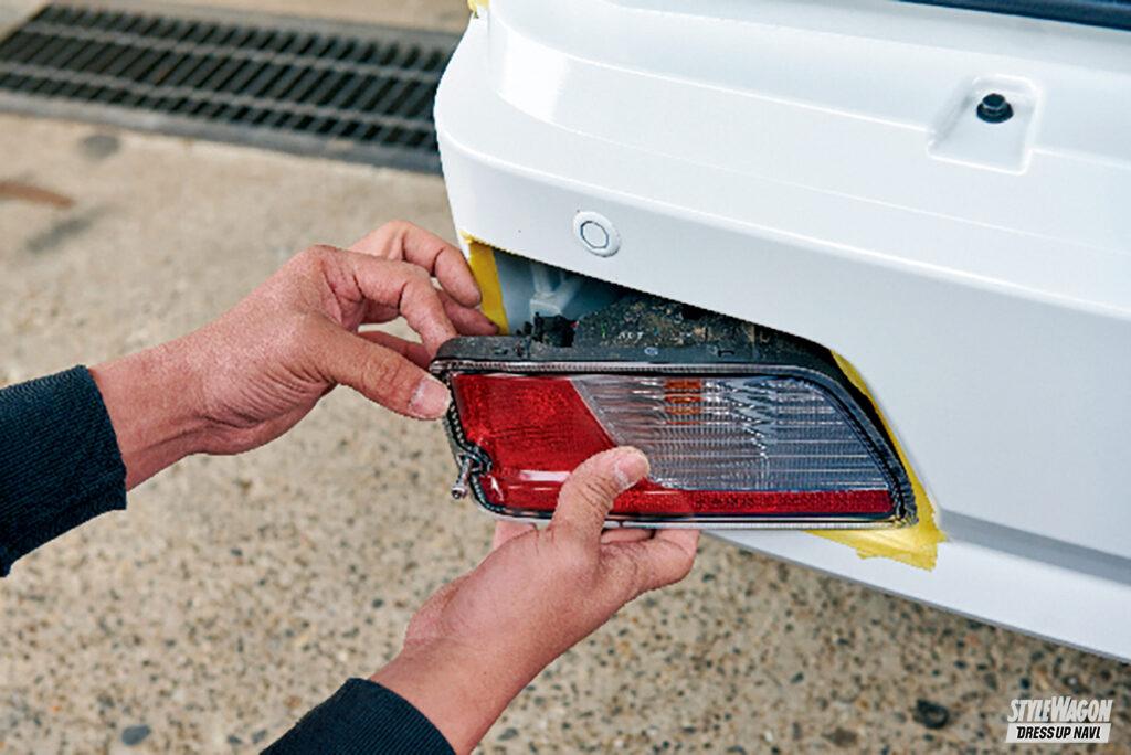 リアバンパーは先代のハイゼットカーゴと同じく、テールランプが内蔵された作りとなっている。これは商用車として、リアゲートの開口を少しでも広くするための工夫である。フロントバンパーと同じくセンサーが付いており、リアバンパーを外すためにはこのセンサーのカプラーを抜く必要がある。しかしバンパーの奥はすぐボディの鉄板があり、「スペースが狭いので手が入りにくいです」。ナンバー灯のカプラーも抜かないとならないが、こちらは無理に手を入れて抜こうとせず、外側からナンバー灯本体を外してカプラーを抜いた方がスムーズ。あとはリアフェンダーやテールランプまわりなど、バンパー脱着の際キズが付かないように養生することをお忘れなく。
