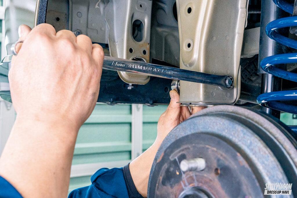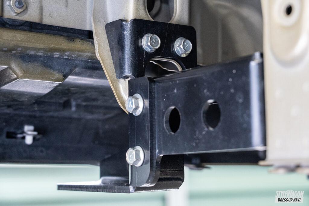 クルマのリアビューにワンポイントのアクセントを与えてくれる牽引フック。ファッションとしての牽引フックも多い中で、見た目カッコよくなるだけではない牽引フックがGTカープロデュースのそれ。ポイントは車体に取り付けたブラケット。このブラケットがガッチリと車体と牽引フックを一体化し、実際に引っ張っても壊れてしまわないだけの強度を生み出してくれるのだ。また、取り付けにおいてもポイントはブラケットにある。これをしっかりと取り付けることができれば、あとは牽引フック本体をボルト・ナットで留めるだけ。なお、車体を上げる際は必ずウマをかませて欲しい。