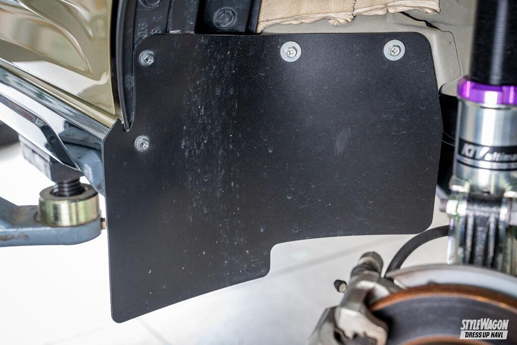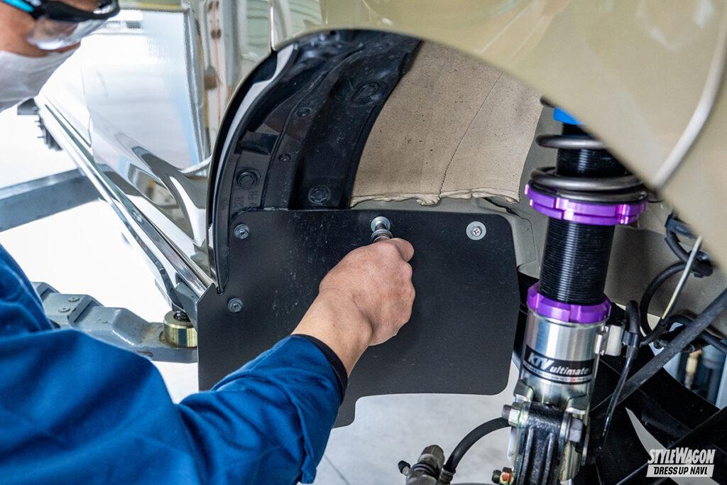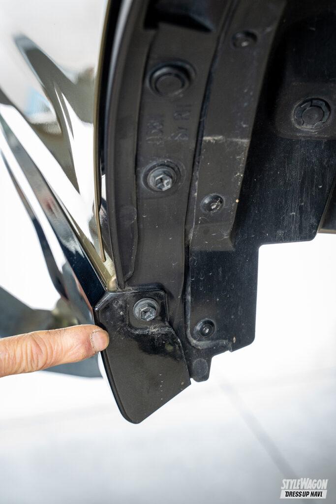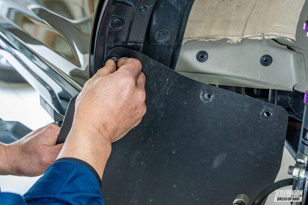 足元のドレスアップとして最適なマッドフラップ。ファッション性を上げるアイテムとしてもとっても人気だが、実は自分で付けられるほど取り付けは簡単。特にフロントは車体に元からあるサービスホールを使ってボルトで留めるだけ。なお、GTカープロデュースのフロントマッドフラップは内側までカバーするように大きく作られているので機能性も抜群だ。