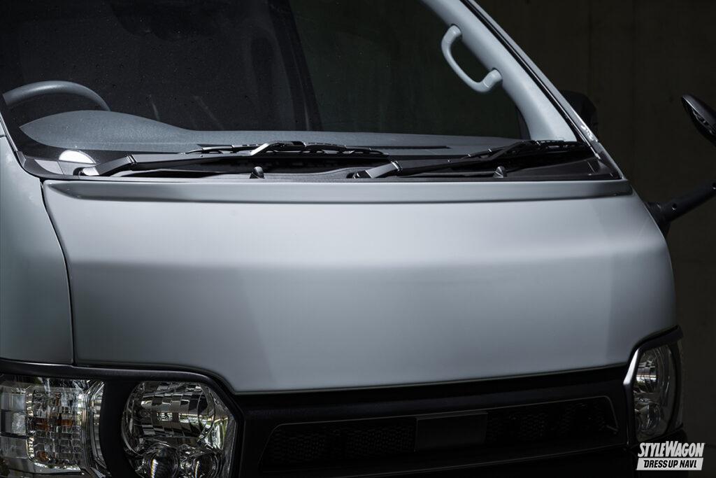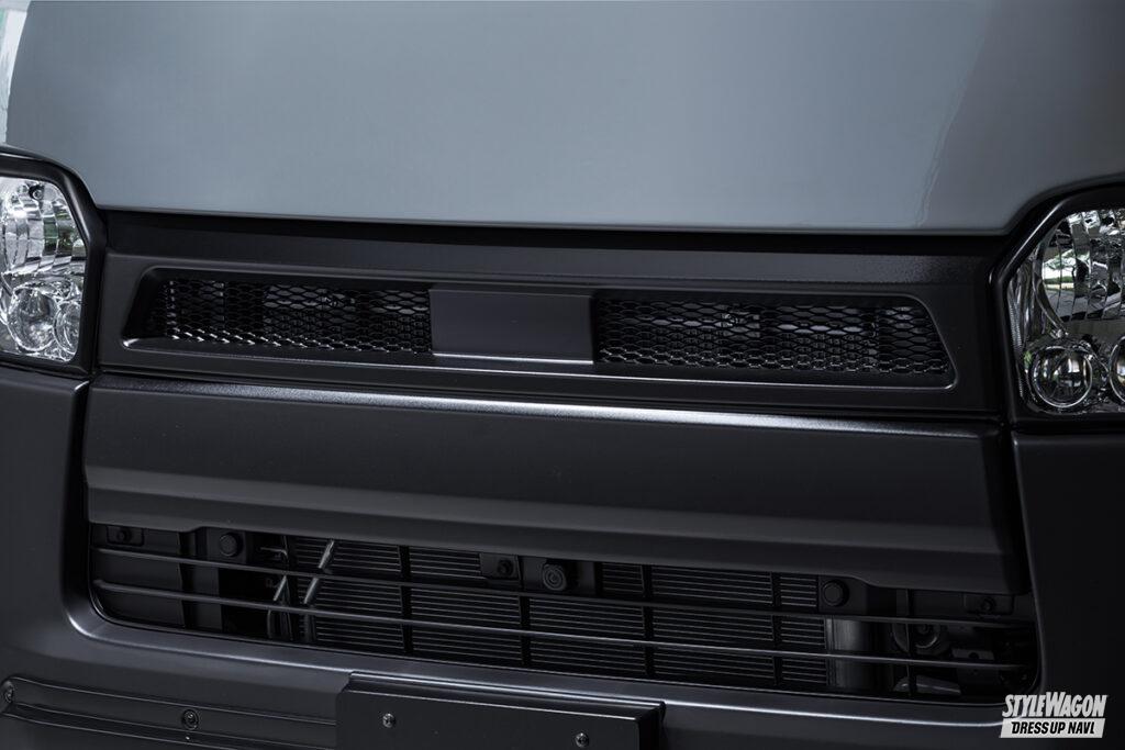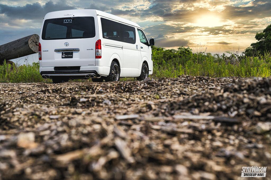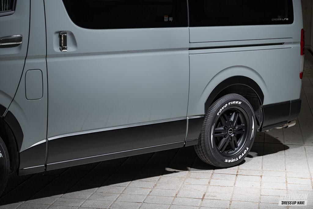 ドレッシー路線のグレースラインとは別に、昨今ますます注目度を高めているオフスタイルを意識した、独自のオフ系エアロも提案するエクスクルーシブゼウス。クロスラインは、走る路面状況を気にしない、ハイエース本来の実用性に配慮したコンパクトなサイズとした実用的なボディキットだ。オフを感じさせる、それっぽさを盛り込んだ意欲作となっている。