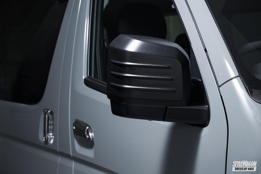 ベースエアロは前後バンパー裾に被せるアンダーガード式。凹凸のハッキリとしたゴツさもさることながら、ビス留めも意匠の一部とするなど、ラギット感の強い仕上がりが見所だ。サブパーツの充実度も特徴で、ボンスポ一体形のエアロボンネットや、プレーンなフロントグリルを筆頭に、アイマスク的なライトガーニッシュ、ドアミラーをスポーティに魅せるフィン付きカバーなど、他社にない珍しいパーツも揃う。