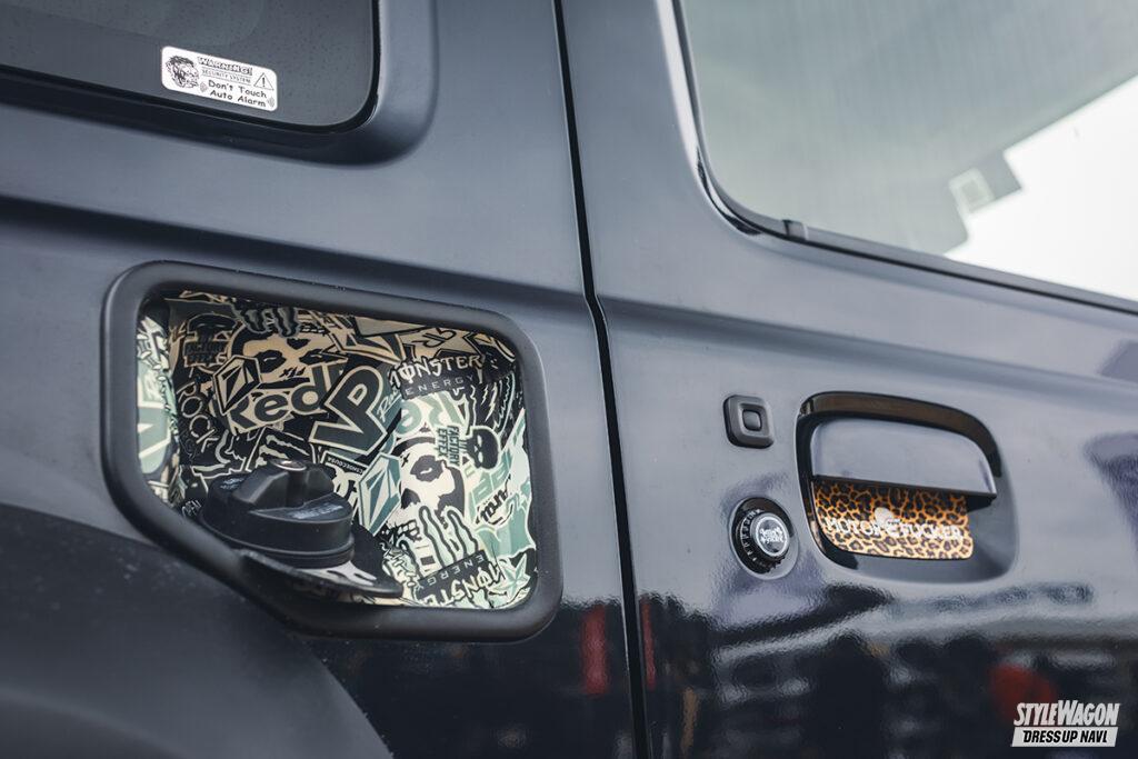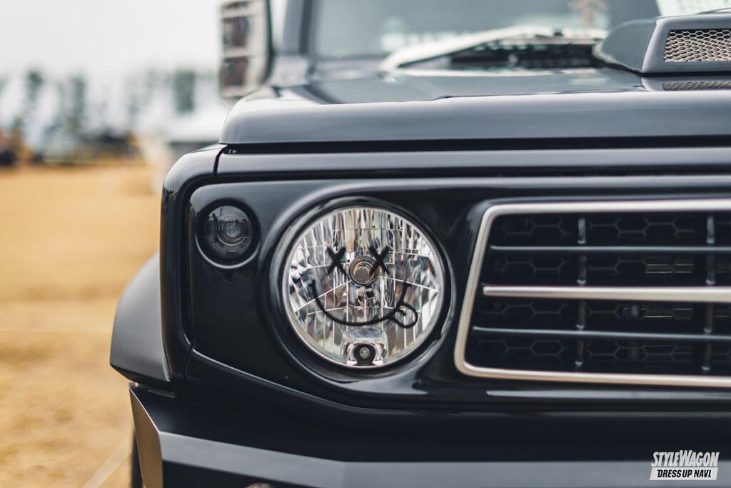 自慢のパーツはビヨンドジャパンのフェイスグリルSu11。昔のサニー風のデザインが特徴で、純正丸目ライトとのマッチングもバッチリ。細部をDIYで塗り分けしてメリハリを付けた。個性的なのが懐かしのカルフォルニアミラー。こちらは初代ワゴンRの純正オプションを加工して装着。ルーフラックはゴツい社外品が数多く売られているが、あえてレトロなムードが漂うタフレックを選んでまとまりの良いスタイリングをゲット!