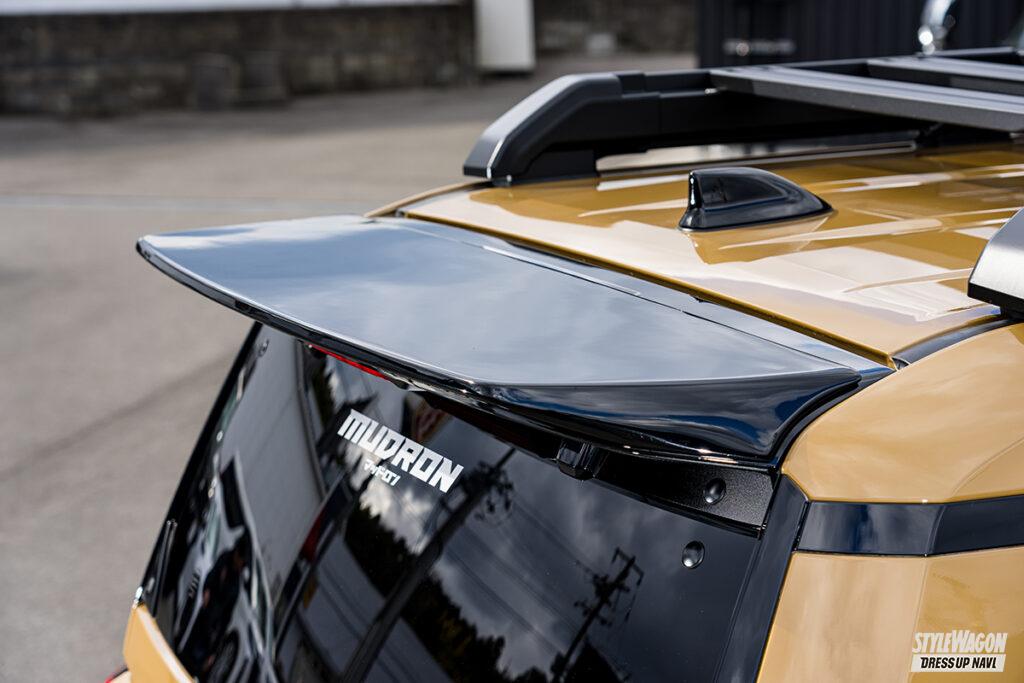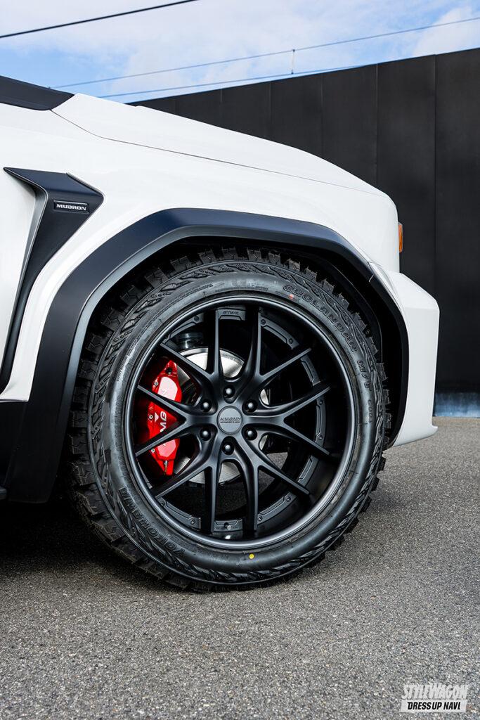 一方のマッドロンスポーツは大径タイヤに漆黒のホイール、リフトアップを組み合わせたオフローダーらしさ全開な仕様。フロントのバンパーガードやエクステンション、ワイルドなボンネットダクトカバーなどはオフ感が全開。躍動的なリアウイングでアクティブさも演出している。