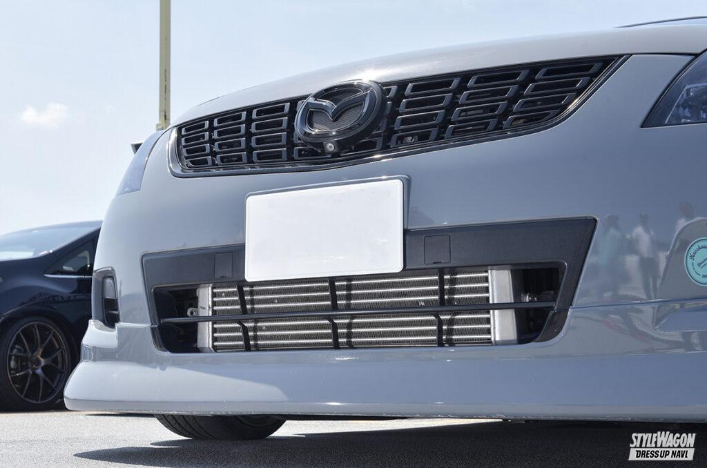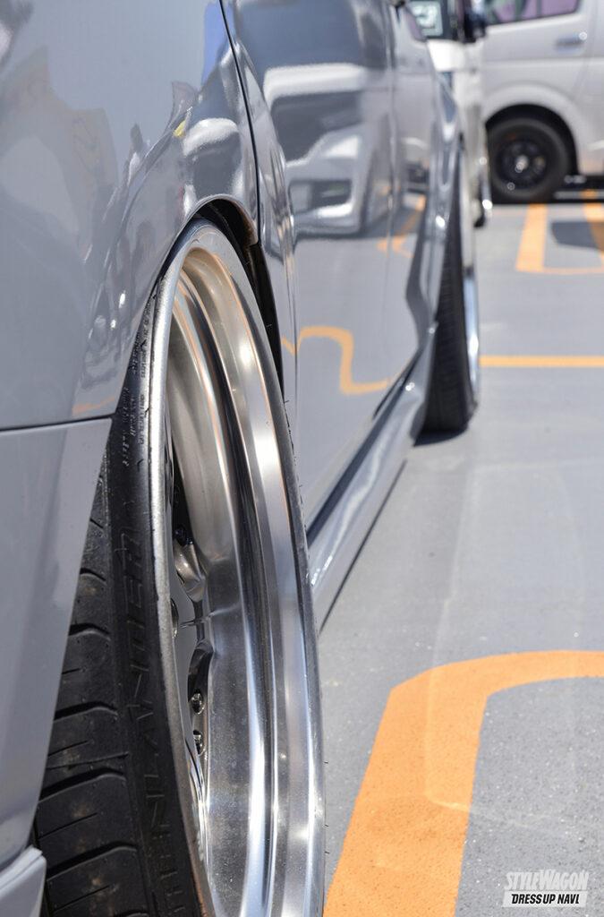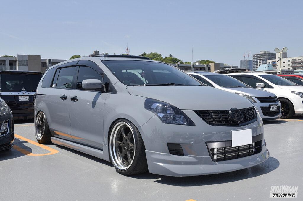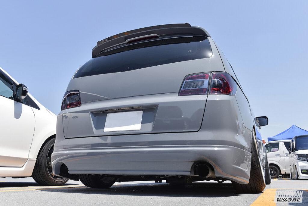 オーナーにとって3台目となるMPV。1台にかける情熱がハンパないが、カスタマイズへの意欲も満々。昨年のMPV全国オフに向け、ガッツリと作り込んだのが現在の仕様である。実用性に優れたエアサスではなく車高調によるローフォルムやツラ具合を見れば気合いの入り方は一目瞭然だが、ボディカラーがオリジナル調合のグレーだから以外にもハデな印象はない。オールペンついでにエンブレムなど各部をスムージングして、スッキリとした雰囲気。エアロはケンスタイルのハーフタイプを選んでボリュームアップ。リアはリフレクターを埋めてツルンとした仕上がりで魅せる。そしてエンジンはブーストアップ、車内はレカロシートや追加メーターの導入で走りも楽しい。