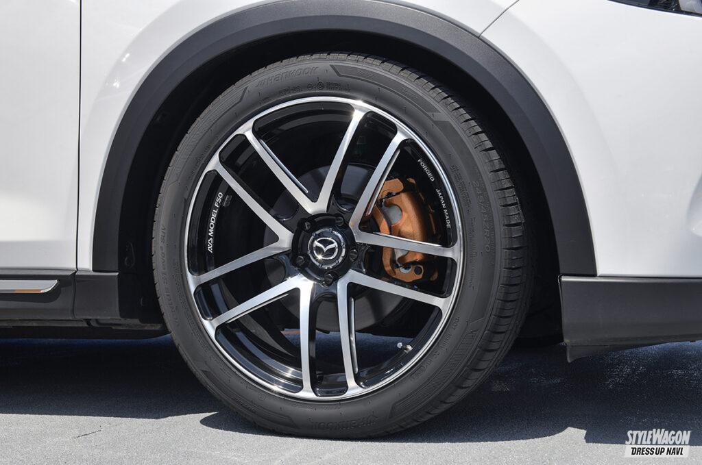 ホイールは足長スポークのAVS·F50。純正っぽい雰囲気を出すために、φ数が合うマツダ純正のセンターキャップを探して装着したのがポイント。足まわりはテインの車高調にハイパコのバネを組んで、乗り心地を向上。