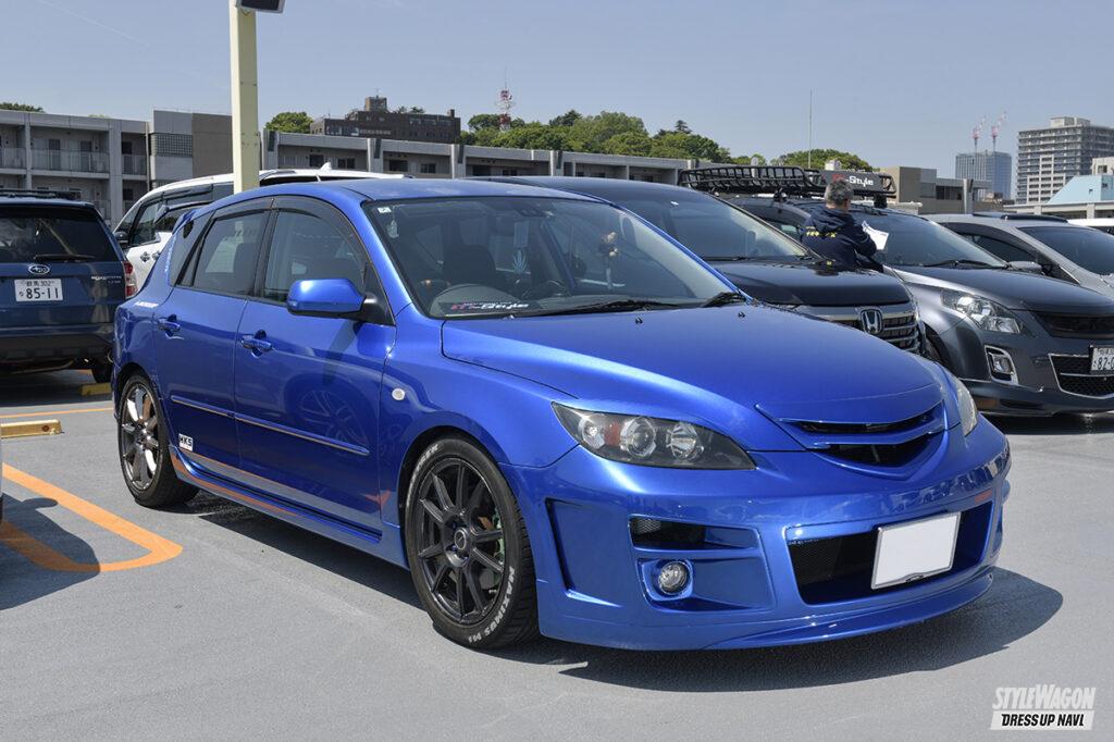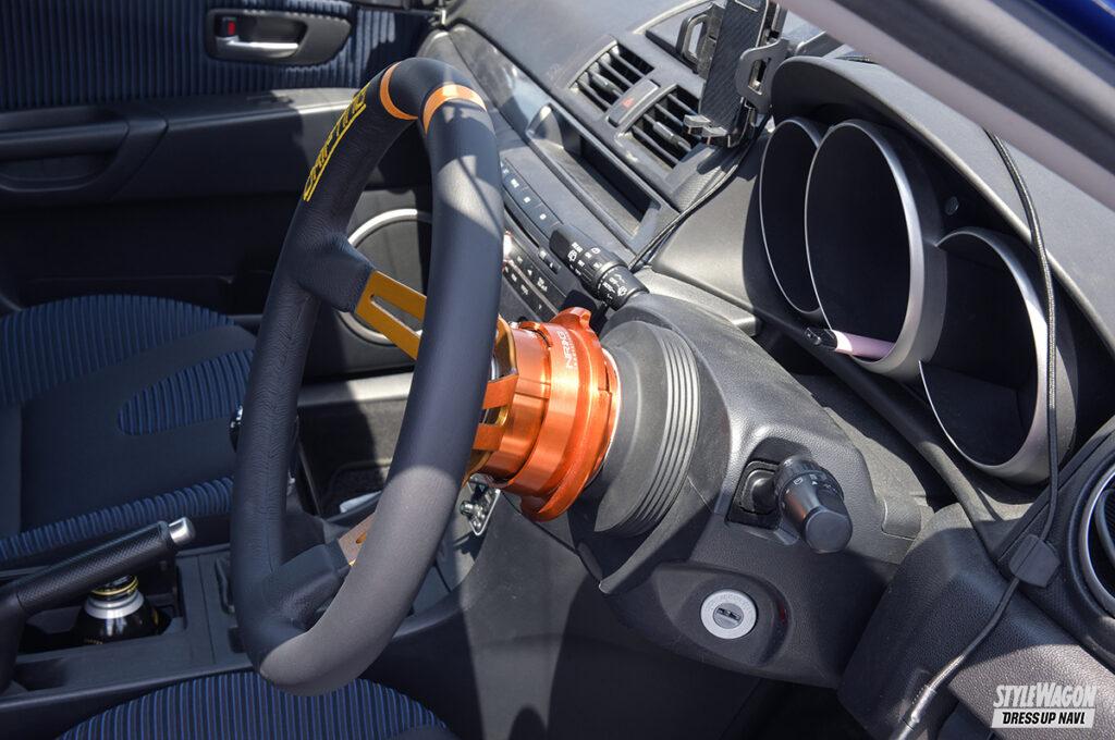 オートエクゼのエアロを組んでイメージを変えた小川さんのアクセラスポーツ。さらに汎用GTウイングを装着してスポーティ感を際立たせた。内装もモモのステアリングとクイックリリースボスでテンションを上げる。