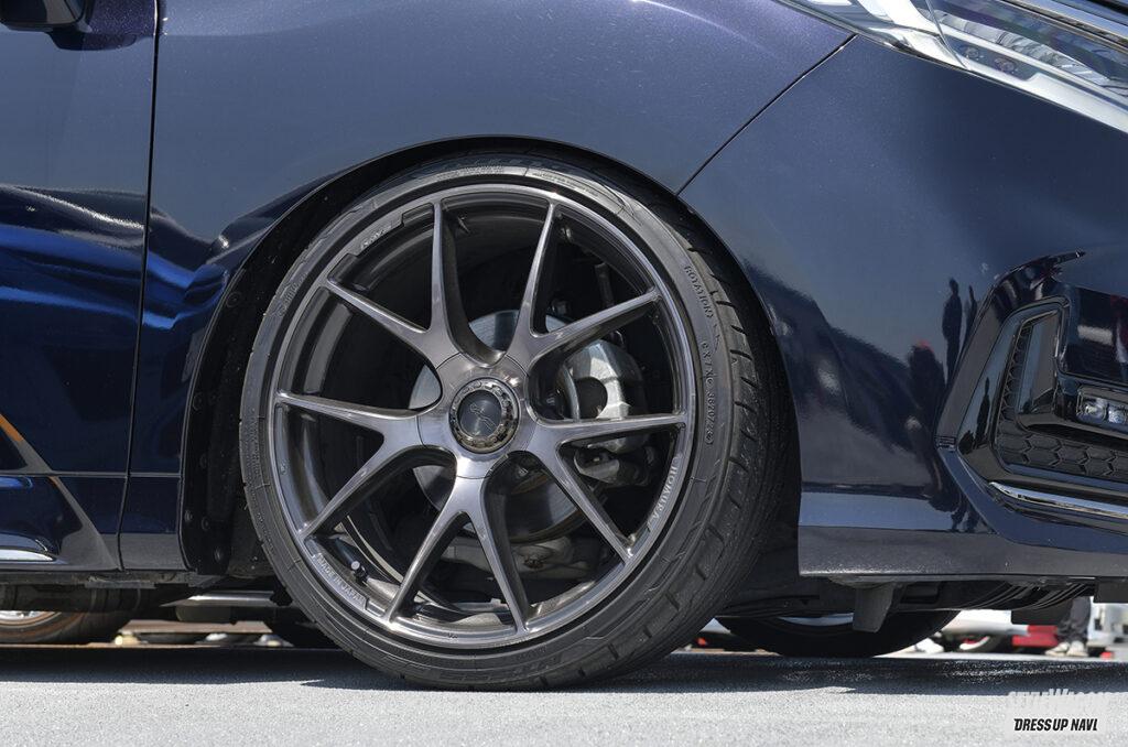 MPVからオデッセイに乗り換え、足元を中心に手を加えてさり気なく違いを出す。ホイールはナットホールを画したデザインが特徴のホムラ2×5S。足まわりはラルグスの車高調を組み、前後バランス良くローダウン。