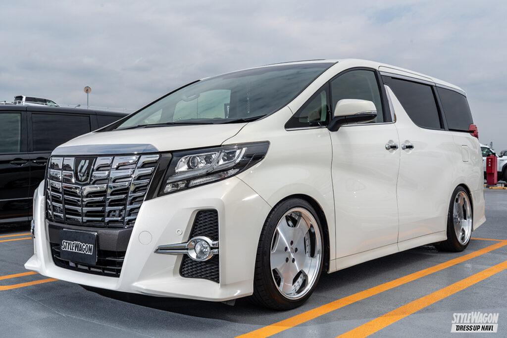 足元にはディッシュホイールを合わせ、往年のカッコよさを感じさせるアルファード。テールレンズも交換し、キレイな光り方のそれへと変更。シンプルな中にもアクセントをプラスし、見る者を魅了する。